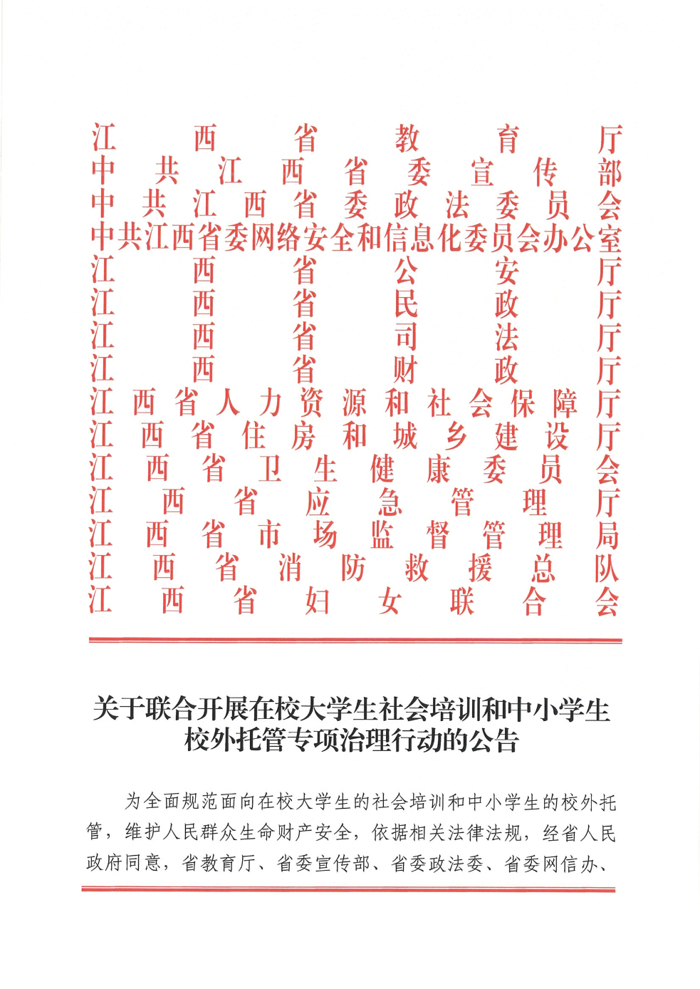 关于联合开展在校大学生社会培训和中小学生校外托管专项治理行动的公告