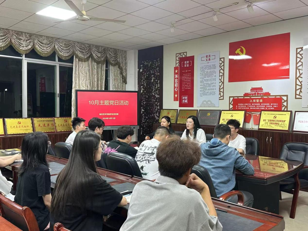为庆祝中华人民共和国成立75周年,深入学习贯彻党的二十届三中全会精神。2024年10月11日,抱石艺术学院学生党支部积极开展10月主题党日活动,学习贯彻党的二十届三中全会精神,深入学习习近平总书记在国家勋章和国家荣誉称号颁授仪式上的讲话等近期重要讲话、重要指示批示和重要文章精神。