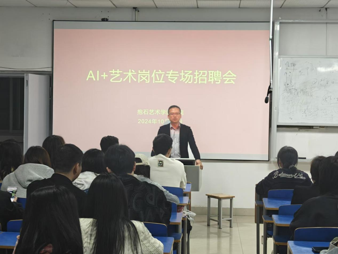 2024年10月30日晚上18:30,抱石艺术学院 AI + 艺术岗位专场招聘会在艺术楼401教室成功举办。此次招聘会为抱石艺术学院视觉传达设计专业学生与相关企业搭建沟通桥梁,推动 AI 技术与艺术领域的深度融合,也为学生提供更多的就业机会和职业发展空间。全体视觉传达设计专业毕业生参会。