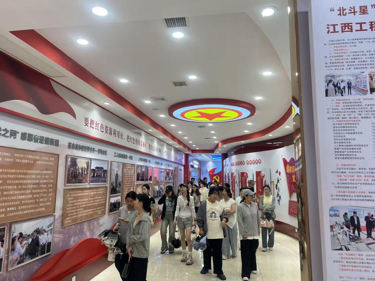 参观首站来到江西工程学院新时代文明实践中心。在讲解员的引导下,新生们沿着历史脉络缓缓前行。展区内,泛黄的革命文献原件、珍贵的历史照片、还原历史场景的雕塑模型,以及循环播放的红色纪录片,让抽象的党史变得生动可感。从嘉兴南湖红船的“敢为人先”,到长征路上的“坚韧不拔”;从抗日战争的“众志成城”,到新中国成立的“改天换地”;从改革开放的“锐意进取”,到新时代脱贫攻坚的 “众志成城”“科技创新的自立自强”,每一个历史节点背后的故事,都深深吸引着新生们的目光。