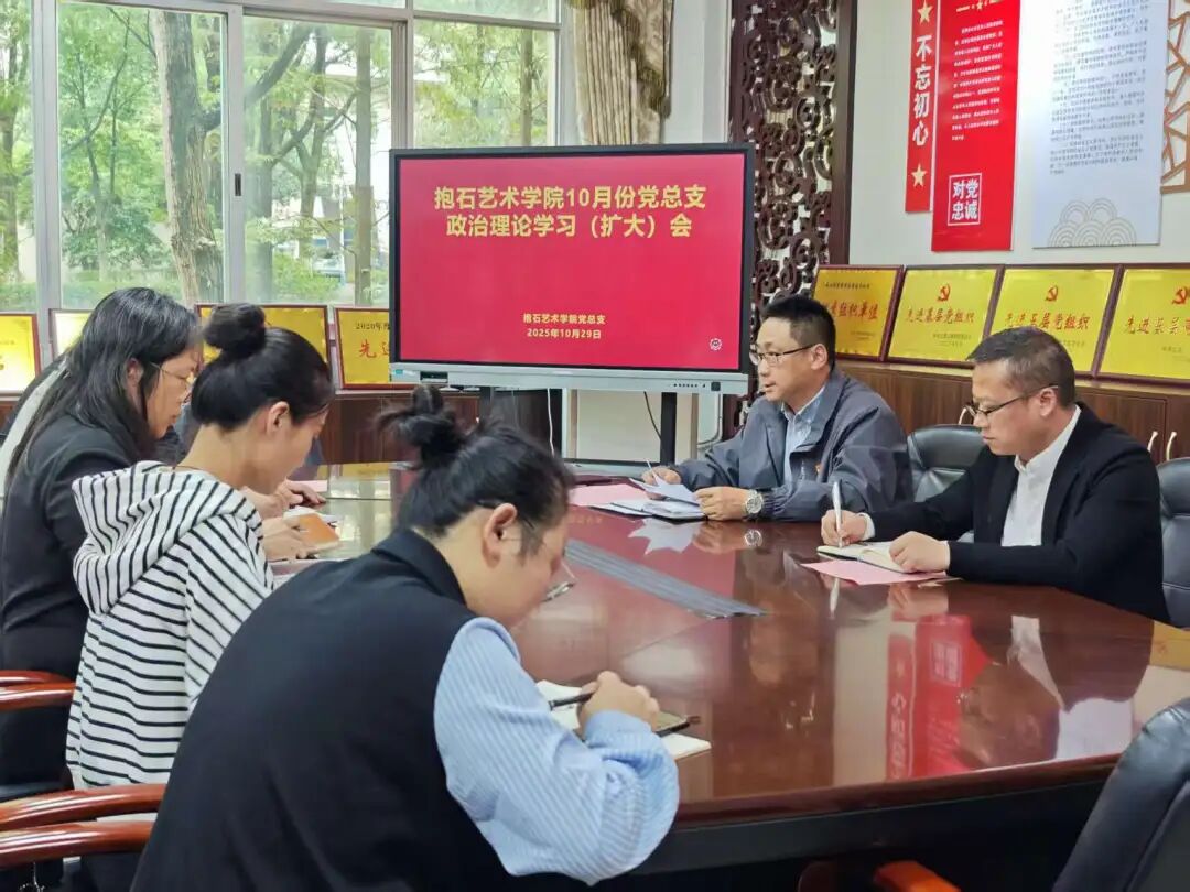 10月29日下午,抱石艺术学院党总支在艺术楼202党员活动室召开10月份政治理论学习(扩大)会议,会议以“深入学习党的二十届四中全会精神聚焦“十五五”规划以党建引领本科教学工作评估提质增效推动学校平安有序发展”为主题。学院党总支书记刘永东主持会议,抱石艺术学院院长张志胜、副院长王冬冬、各教研室主任、各支部委员及全体教师党员出席会议。