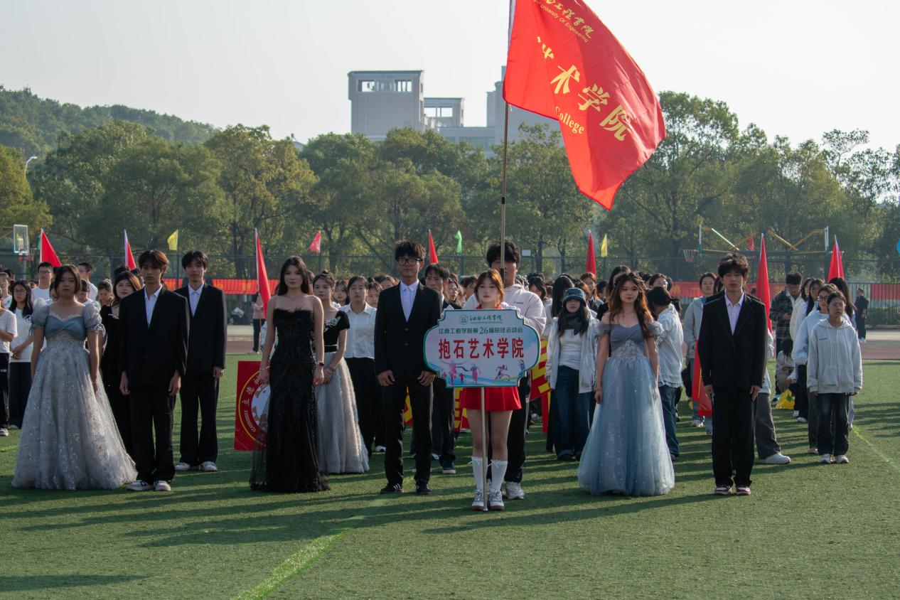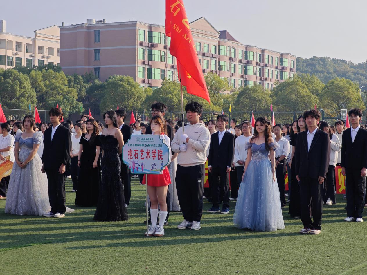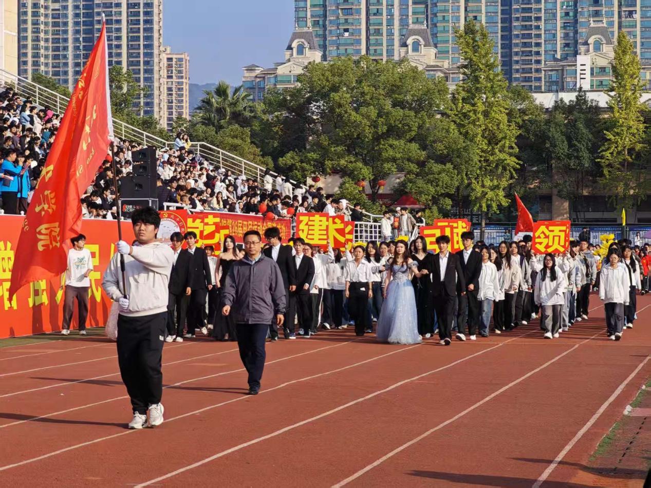 伴随着激昂的运动员进行曲,各学院方阵依次通过主席台接受检阅。抱石艺术学院方阵作为特色亮点方阵,甫一出场便赢得全场瞩目。方阵成员身着特色服装,手持精心制作的道具,步伐整齐划一,精神抖擞。方阵前方,数名同学手举“党建引领、艺术赋能、红光铸魂”的特色牌匾,鲜明展现学院理念;行进过程中,方阵成员高声喊出“党建引领、艺术赋能、红光铸魂”的嘹亮口号,充分展现了艺术学子的昂扬斗志。