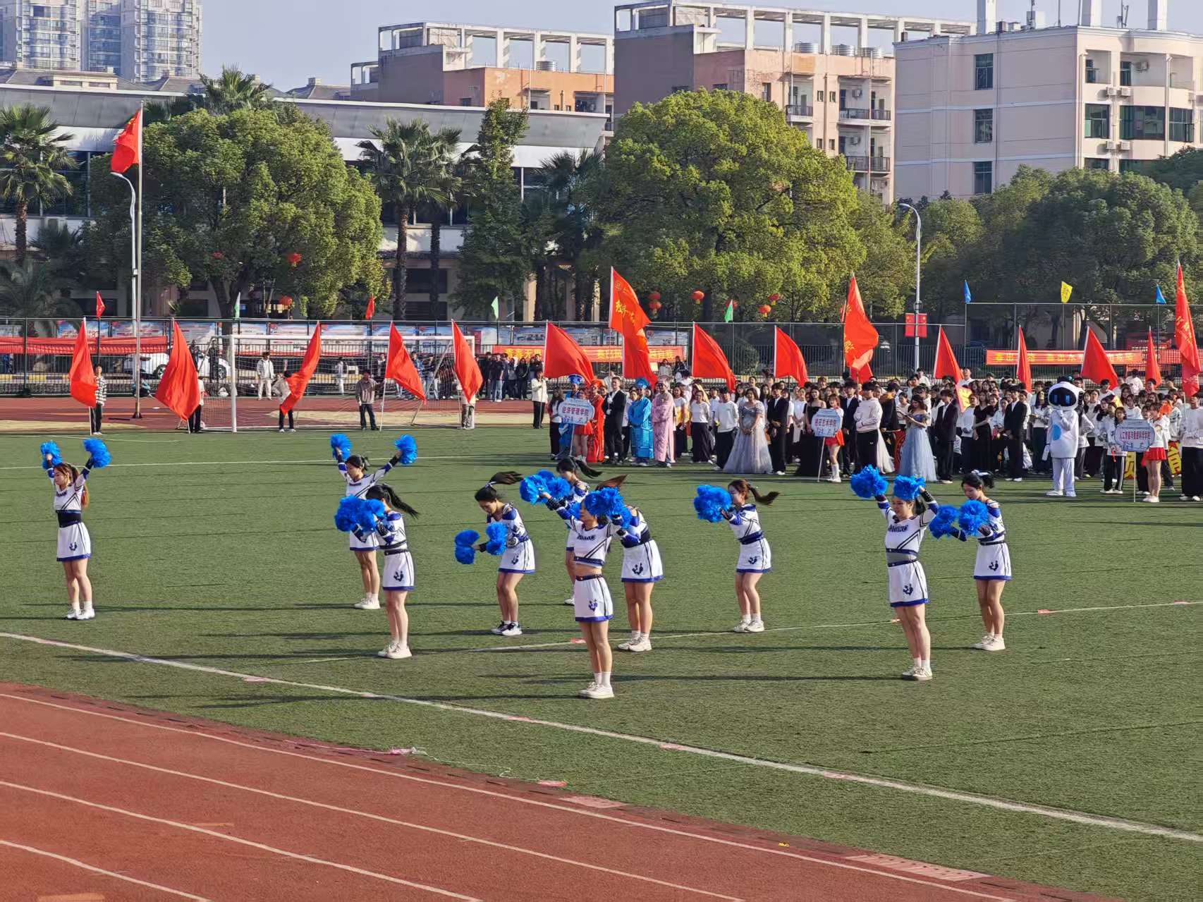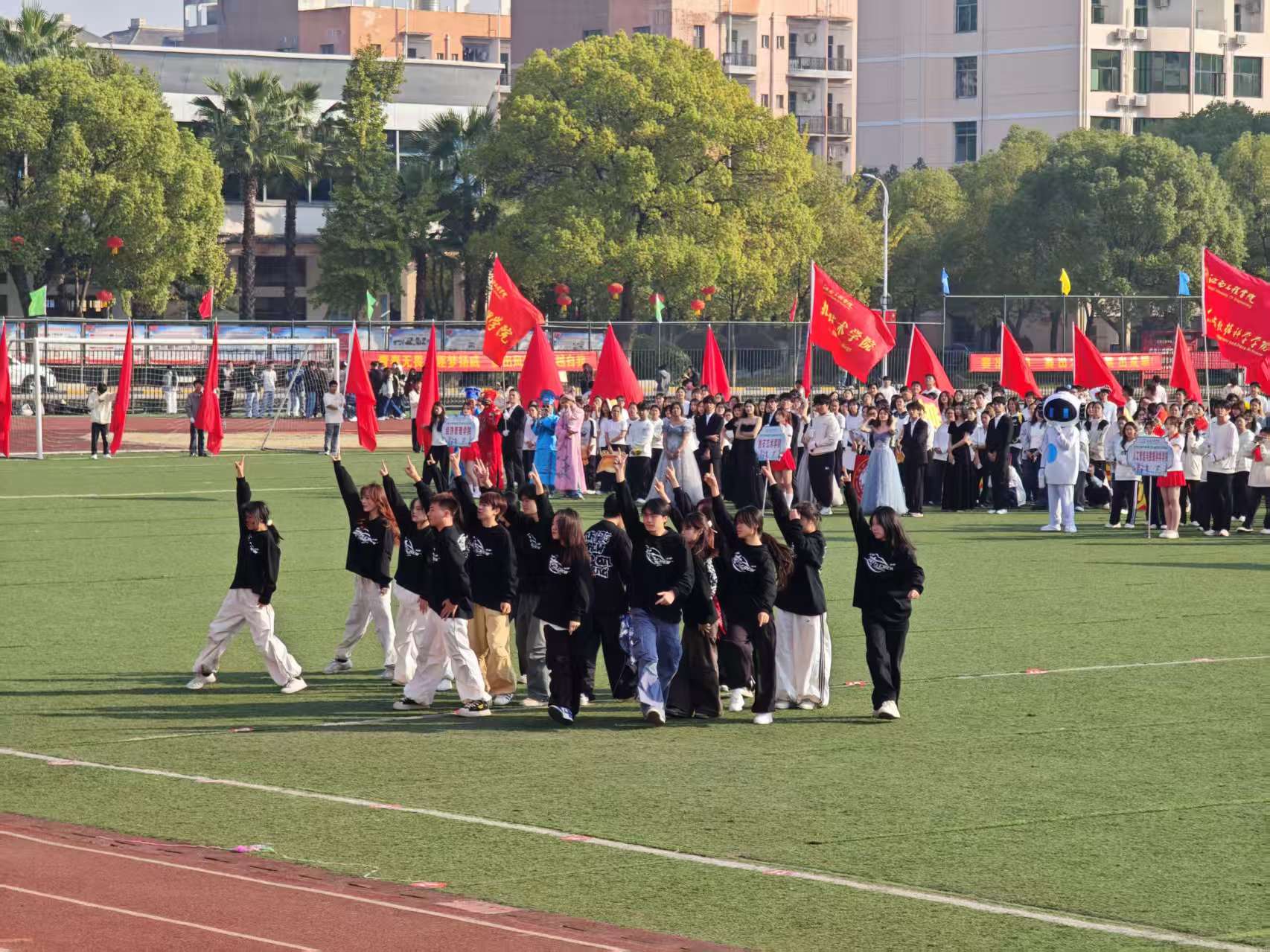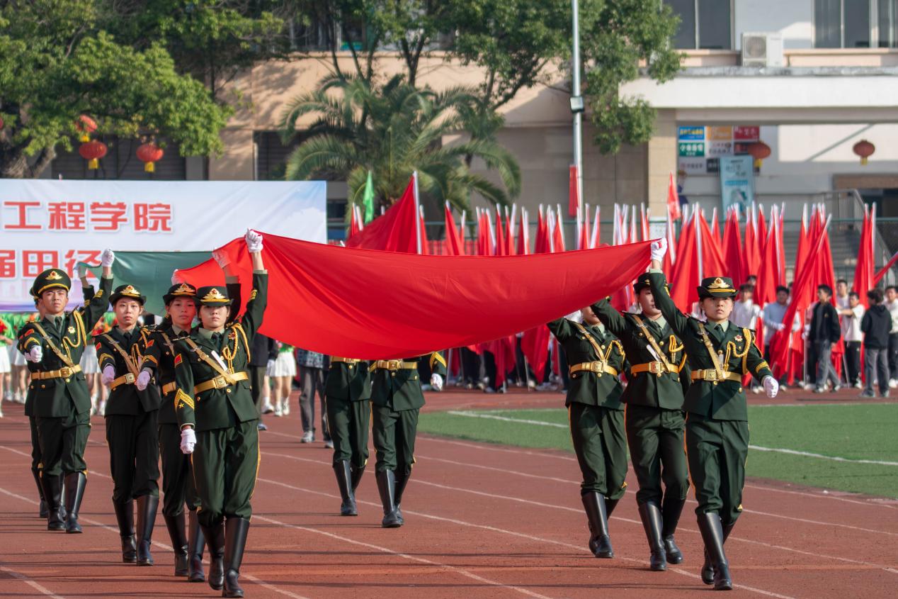 伴随着激昂的运动员进行曲,各学院方阵依次通过主席台接受检阅。抱石艺术学院方阵作为特色亮点方阵,甫一出场便赢得全场瞩目。方阵成员身着特色服装,手持精心制作的道具,步伐整齐划一,精神抖擞。方阵前方,数名同学手举“党建引领、艺术赋能、红光铸魂”的特色牌匾,鲜明展现学院理念;行进过程中,方阵成员高声喊出“党建引领、艺术赋能、红光铸魂”的嘹亮口号,充分展现了艺术学子的昂扬斗志。