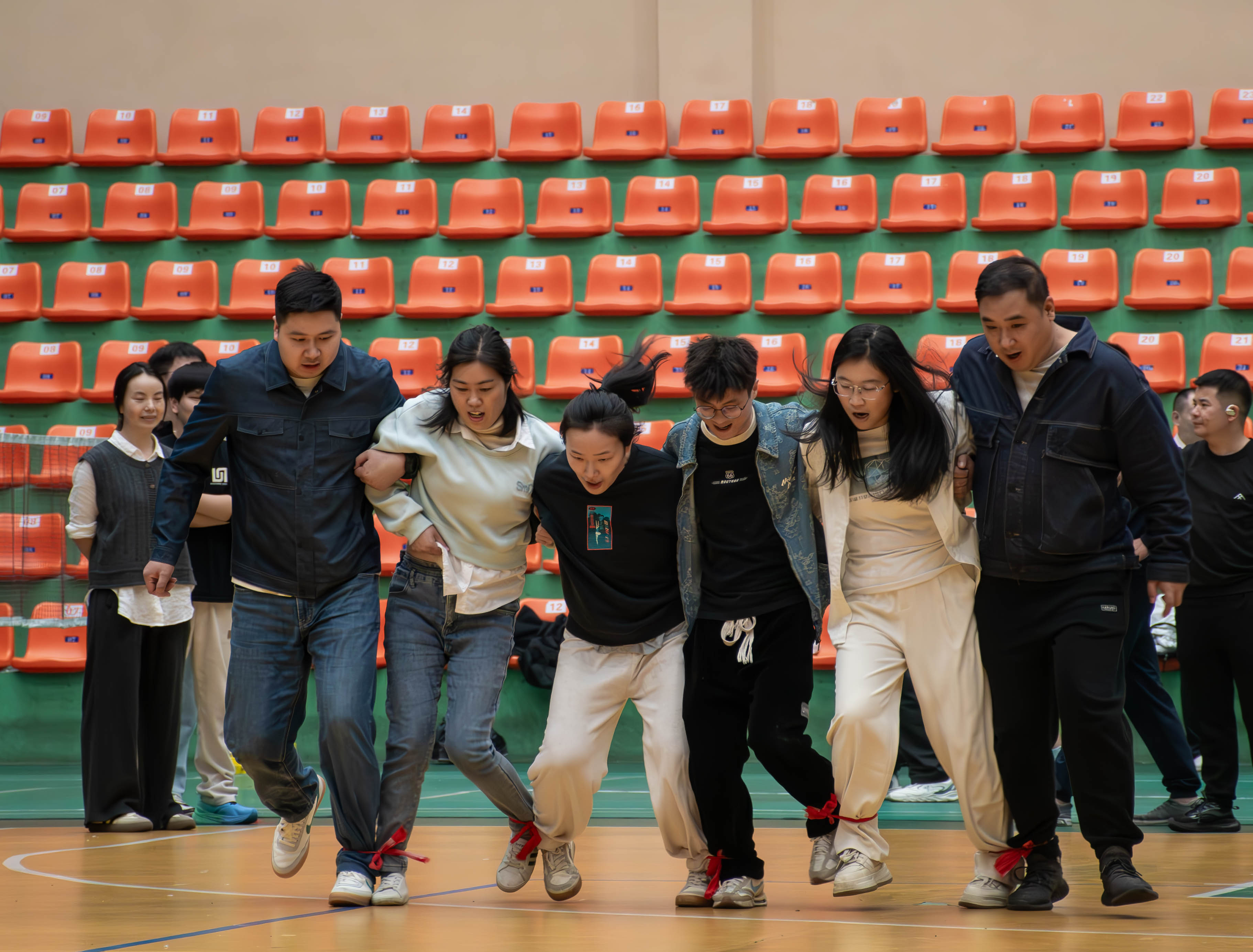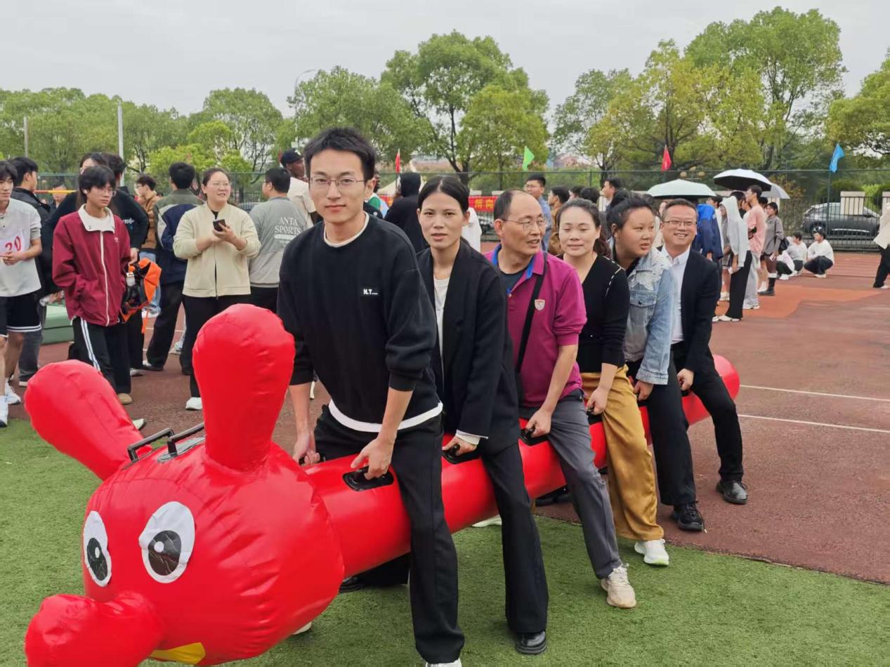 在教师场地,龟兔赛跑、同心击鼓、集体跳绳、六人七足等比赛中,老师们同样热情高涨。所有项目都是一个考验团队默契的项目,龟兔赛跑,每组队员都骑毛毛虫在道具上,那憨态可掬的模样引得在场观众阵阵欢笑。然而,比赛更需要速度与协作,虽然步伐略显缓慢,但一步一个脚印,稳扎稳打地前进着。同心击鼓,通过团结协作,使球能够在鼓面上连续跳动。集体跳绳,长长的跳绳在空中快速飞舞,老师们排成整齐的队伍,依次跳入绳中,开始了有节奏的跳跃。这看似简单的项目,实则对团队的节奏感和默契度要求极高。六人七足,每组老师相邻的腿被绑在一起,形成一个紧密的整体,他们手挽着手,喊着响亮的口号,迈着整齐的步伐向前冲去。刚开始,由于步伐不一致,有些小组出现了摔倒的情况,但他们迅速爬起来,重新调整步伐,继续前进。