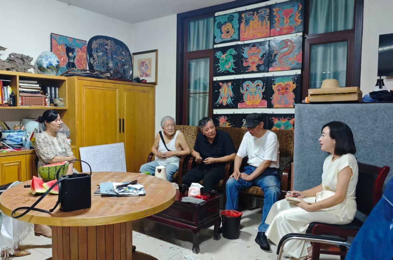 9月11日抱石艺术学院教师、新余市漆画艺委会成员余旭、李莲、聂珺、胡艳等一行来到史卫多彩漆刻工作室进行调研,特邀请了新余市老一辈艺术家陈祖煌、甘育田、史卫老师共话探讨,围绕多彩漆刻工艺的发展历程、制作工艺、材料技法及发展现状开展研讨。