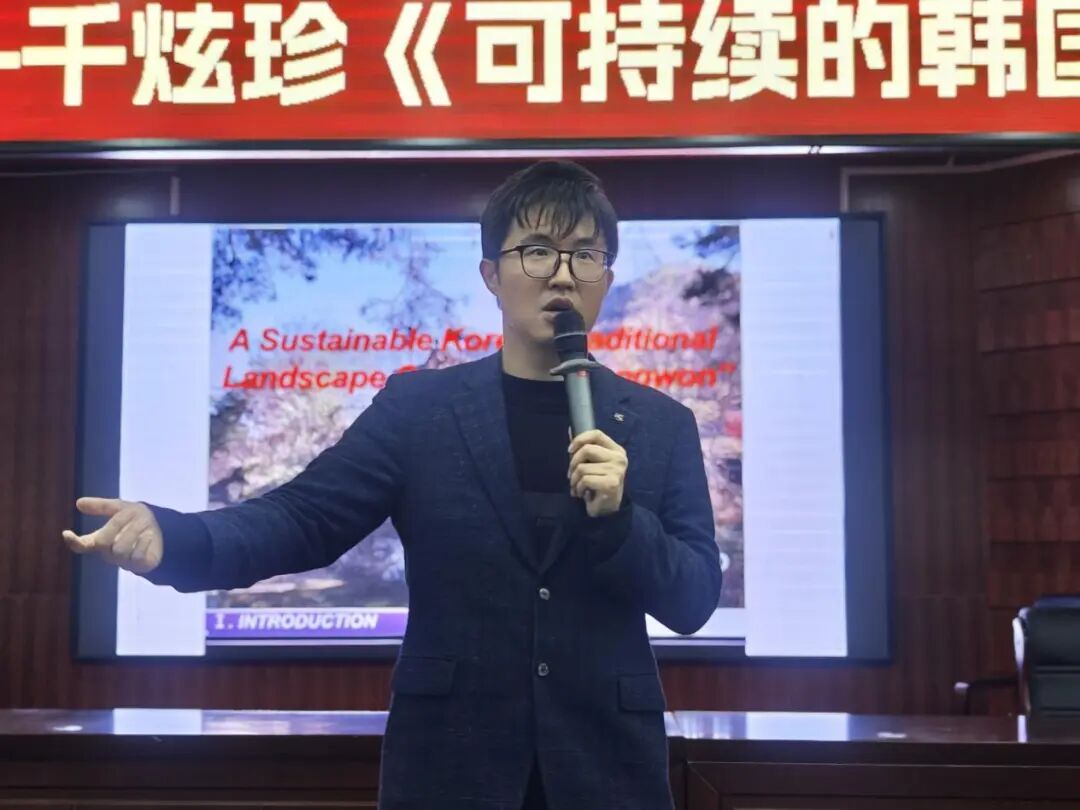 讲座中,千炫珍教授从韩国传统园林的历史渊源切入,系统阐释了其在空间布局、植物配置、材料运用等方面的特色,重点剖析了“可持续理念”在韩国传统园林中的体现——如何通过对自然生态的尊重、本土材料的循环利用以及人文意境的营造,实现园林景观的长效发展。他还结合韩国首尔市线性公园设计、三星集团生态溪塘设计等国际项目案例,生动展示了传统园林智慧与现代设计实践的融合路径,让在场师生对跨文化景观设计有了更直观的认知。