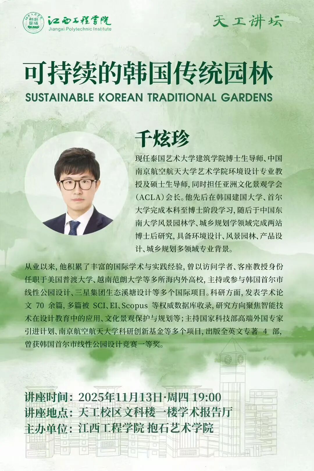 为拓宽师生学术视野,促进国际园林文化交流,2025年 11月13日晚上7时,江西工程学院抱石艺术学院于天工校区文科楼一楼学术报告厅举办天工讲坛专题讲座。本次讲座特邀泰国艺术大学建筑学院博士生导师、南京航空航天大学艺术学院教授千炫珍,以“可持续的韩国传统园林”为主题展开深度分享。抱石艺术学院院长张志胜、副院长王冬冬、全体教师以及环境设计、视觉传达设计等专业的学生出席,副院长王冬冬主持讲座,现场学术氛围十分浓厚。