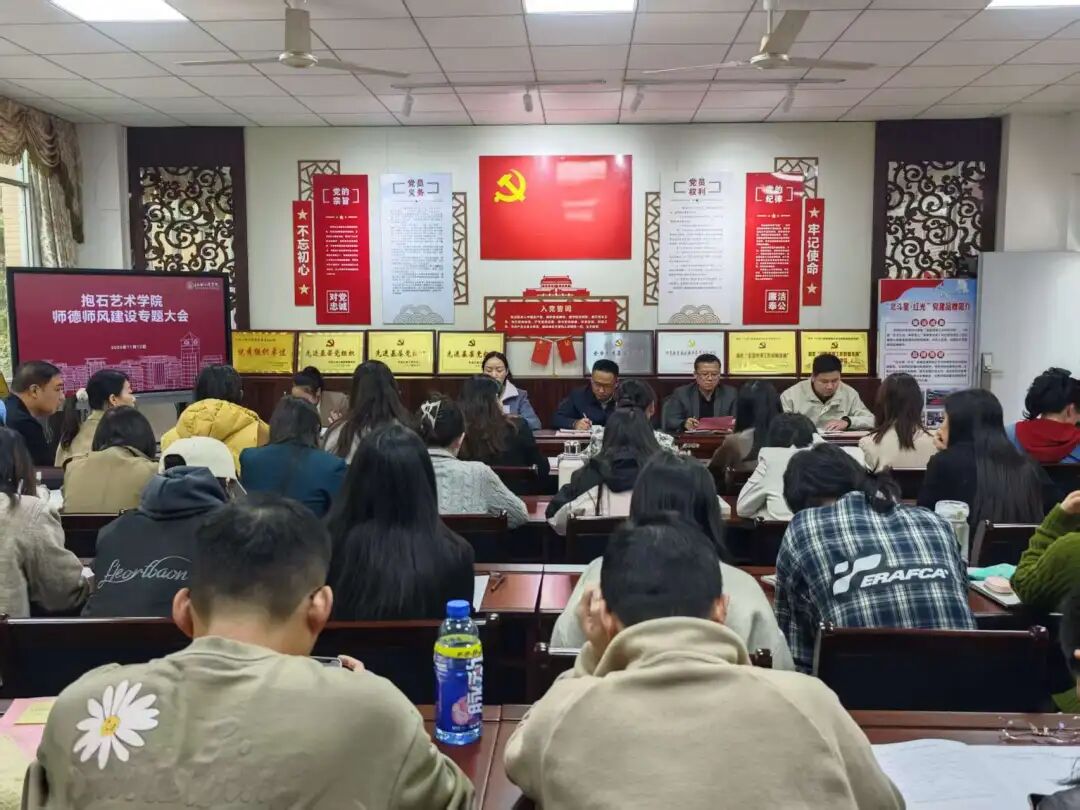 为全面贯彻党的教育方针,落实立德树人根本任务,进一步加强和改进新时代师德师风建设,2025年11月12日下午2:00,抱石艺术学院在艺术楼202会议室召开师德师风建设专题大会。学院全体教师参会,会议由学院党总支副书记姬赛赛主持。