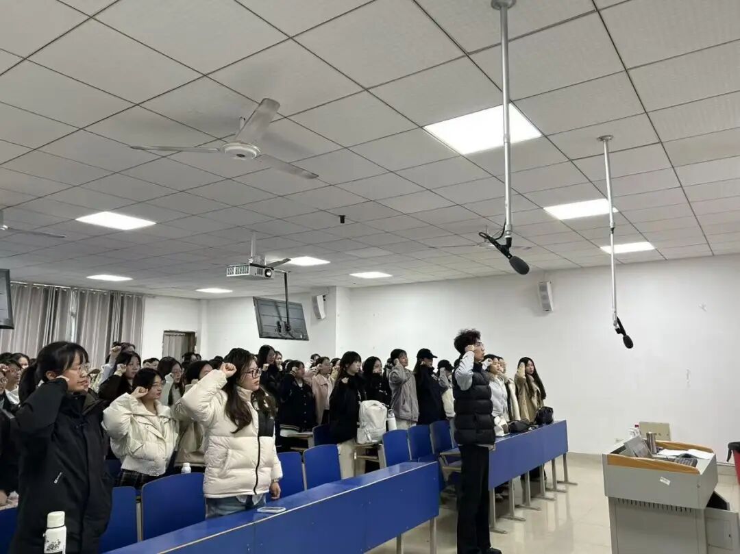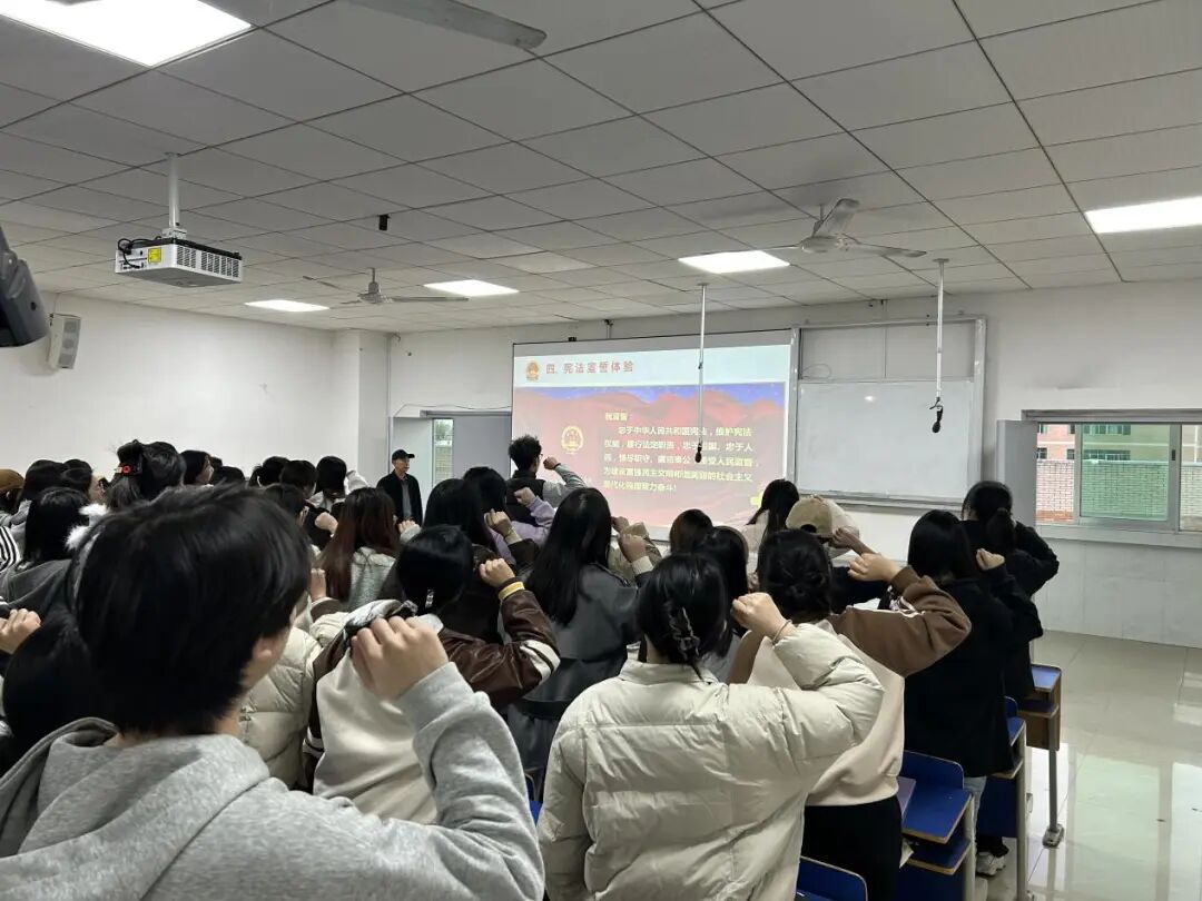 报告结束后,宪法宣誓仪式正式开始。在肖显副团长的带领下,右手举拳,神情庄重地宣读宪法誓词:我宣誓:忠于《中华人民共和国宪法》,维护宪法权威,履行法定职责,忠于祖国、忠于人民,恪尽职守、廉洁奉公接受人民监督,为建设富强民主文明和谐美丽的社会主义现代化强国努力奋斗!铿锵有力的誓言回荡在教室中,不仅是对宪法的庄严承诺,更坚定了学子们尊法守法、践行法治的信念。
