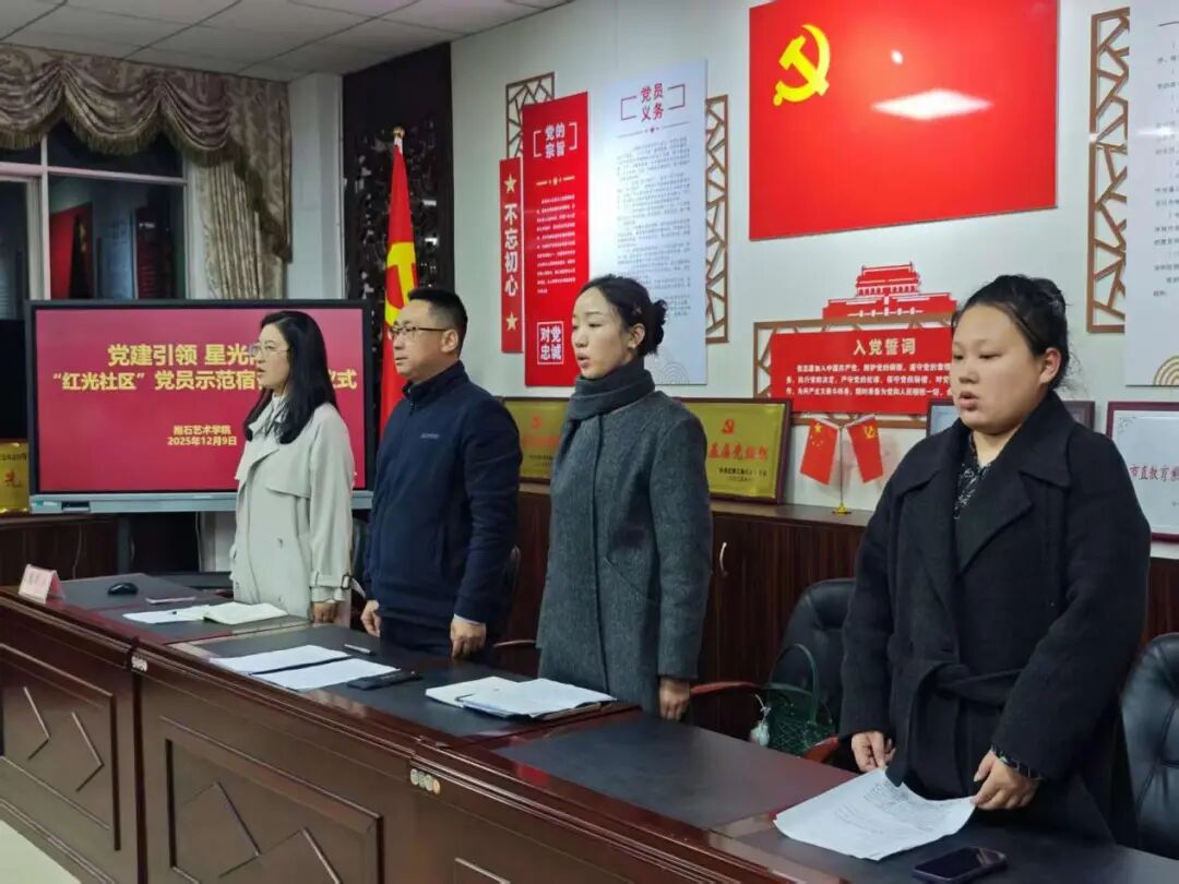 2025年12月9日晚上6:30,抱石艺术学院在学院202党员会议室举行党建引领·星光闪耀——“红光社区”党员示范宿舍授牌仪式。党总支书记刘永东、党总支副书记姬赛赛、专职组织员叶丽、团总支书记答惠琳、全体辅导员以及首批获批“党员示范宿舍”的全体成员、各宿舍学生党员和入党积极分子代表共同参加了仪式,活动由答慧琳主持。