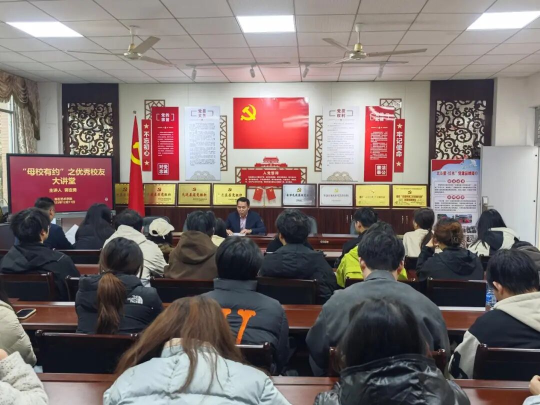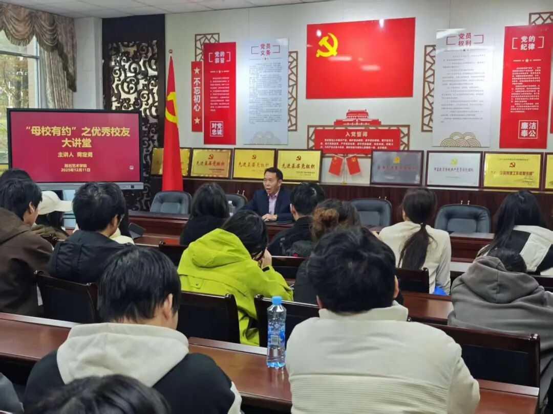 2025年12月11日上午10时,抱石艺术学院“母校之约”之优秀校友大讲堂在艺术楼202会议室如期举行。本期讲堂特邀我院优秀校友、东莞市泽高实业有限公司董事长蒋定勇先生重返母校,为2024级音乐表演本科1班与2024级视觉传达设计本科2班的同学们带来了一场主题鲜明、内容丰富的分享会。