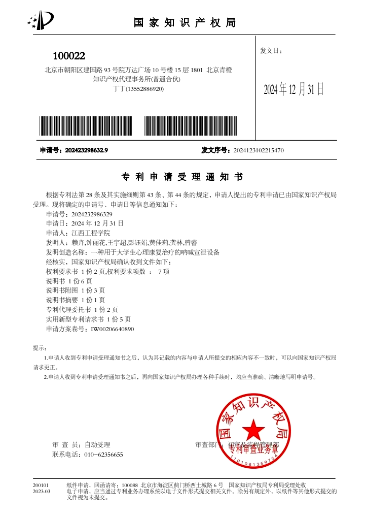 3.2025年作为第一申请人获得《一种用于大学生心理康复治疗的呐喊宣泄设备》专利(受理中)