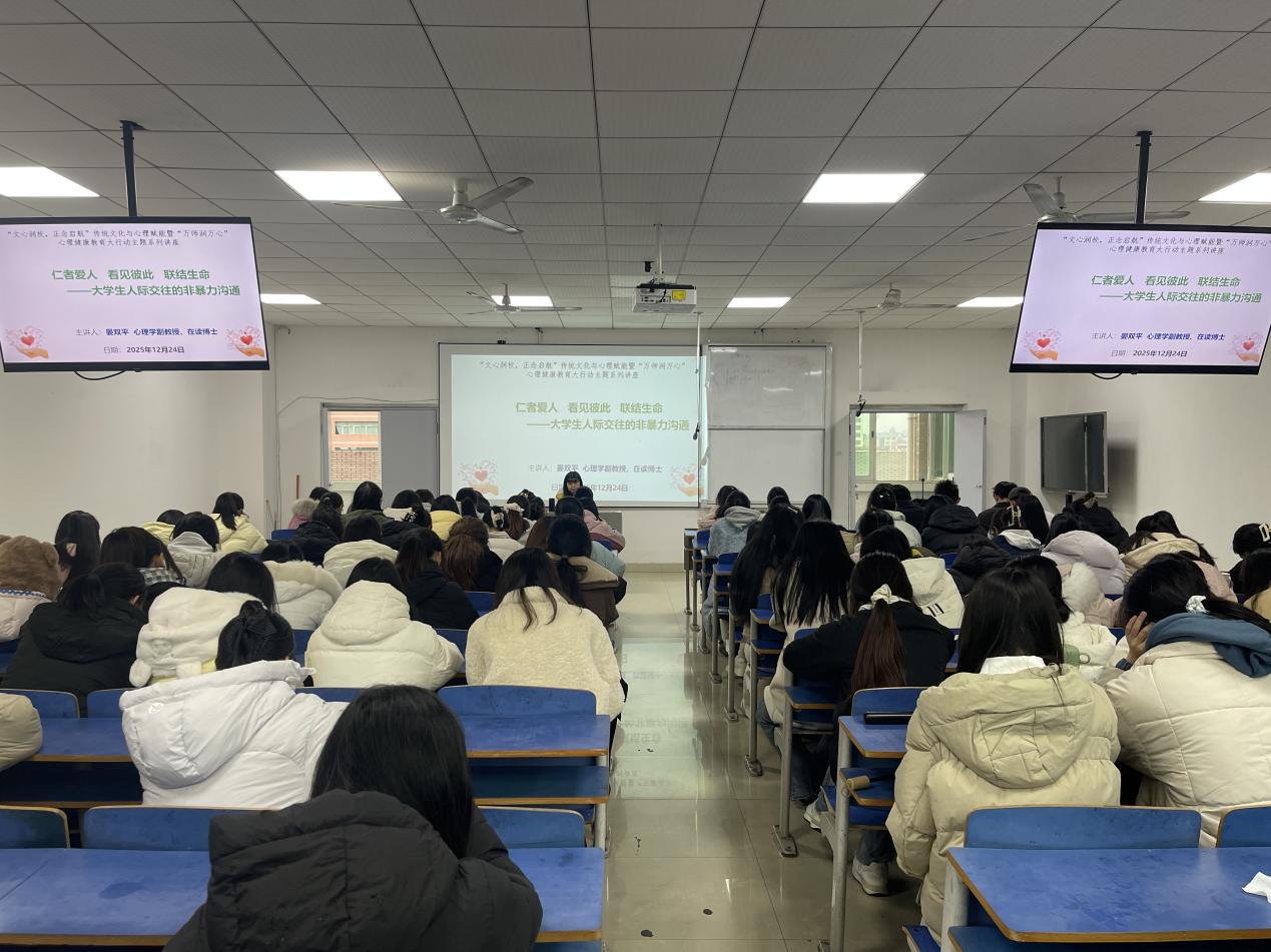 2025年12月24日下午3时,一场主题为“看见彼此,联结生命——人际交往中的非暴力沟通”的心理健康教育专题讲座在艺术楼401教室顺利举行。本次活动面向2023级全体专升本学生,本次讲座由晏双平老师主讲,旨在引导学生掌握有效沟通技巧,提升人际交往能力,营造尊重、理解、支持的校园氛围。