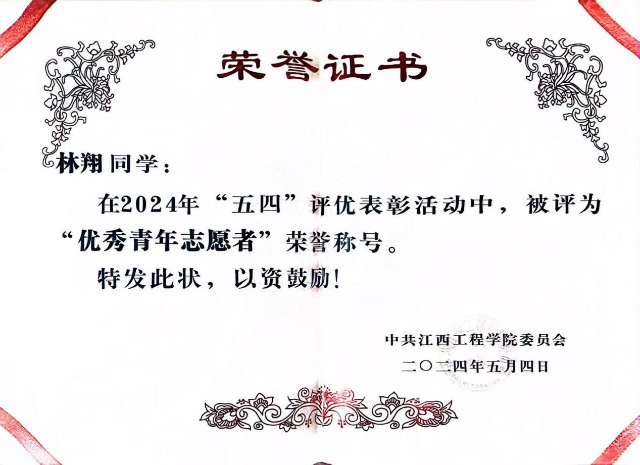 14.2024年在“五四”表彰中被评为“优秀青年志愿者”