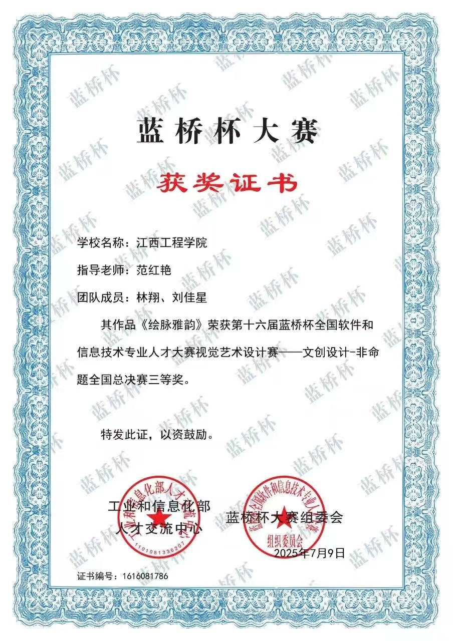 2.荣获第十六届蓝桥杯全国软件和信息技术专业人才大赛视觉艺术设计赛文创设计全国总决赛三等奖。