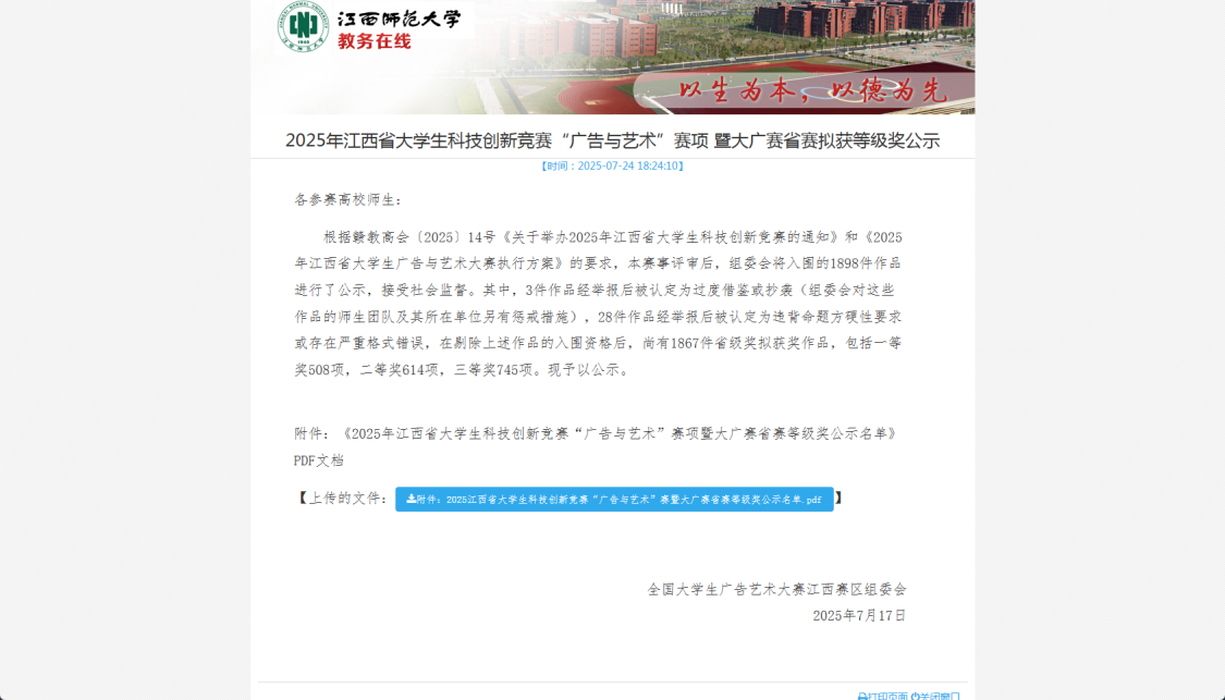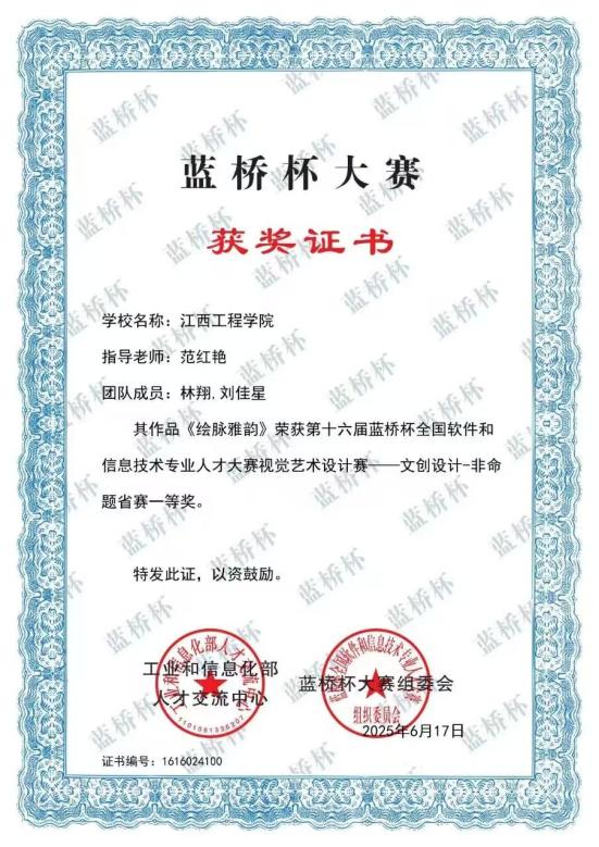 在学科竞赛方面,他与团队成员携手共进,屡创佳绩:其作品《绘脉雅韵》先后荣获第十六届蓝桥杯全国软件和信息技术专业人才大赛艺术设计赛文创设计非命题省赛一等奖、全国总决赛三等奖;作品《星语伴学》在米兰设计周中国高校设计学科师生优秀作品展江西赛区中斩获三等奖;在2025年江西省大学生科技创新竞赛“广告与艺术”赛项暨大广赛省赛中,平面类作品成功入围省级奖项公示名单,展现了扎实的专业功底与创新设计能力。