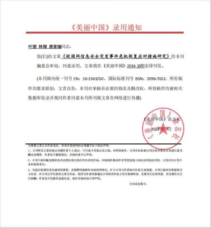 5.发表省级论文《校园网信息安全突发事件危机恢复应对措施研究》