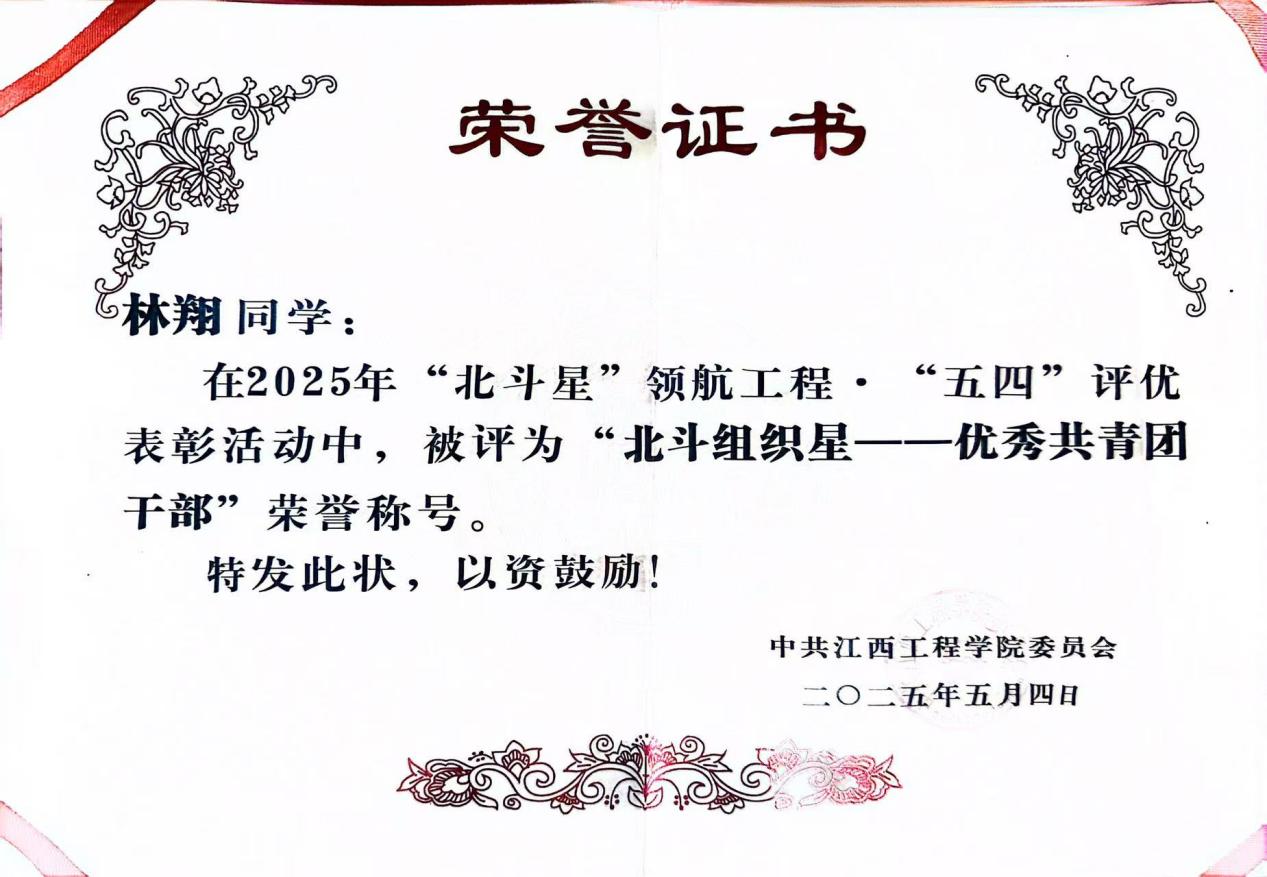 在学生工作中,林翔以学生会副主席的身份主动担当、积极作为,致力于营造优良校园氛围。2024-2025学年期间,他牵头组织开展“礼学之光,学风文明”主题系列活动,通过主题班会、文明监督岗、学风分享会等多种形式,引导同学们规范行为习惯、端正学习态度,有效推动了校园学风建设与文明素养提升;策划并落地“礼润校园,学筑未来”演讲比赛,为同学们搭建展示自我、交流思想的平台,赛事吸引全校各年级数百名学生报名参与,经过初赛、复赛、决赛的层层选拔,不仅涌现出一批优秀演讲人才,更传递了向上向善的校园正能量,得到师生广泛好评。除了校园内的深耕细作,林翔还积极投身社会实践,全面提升综合素养。2025年暑期,他主动牵头组建志愿服务队,带领学生会骨干与专业同学深入新余市周边乡村开展“三下乡”活动,结合视觉传达设计专业特长,为乡村绘制文化墙、设计农特产品包装、开展文明礼仪宣讲,助力乡村文化振兴,累计服务时长超200小时,团队事迹被当地媒体报道。他尽职尽责,荣获2025年“北斗组织星——优秀共青团干部”荣誉。
