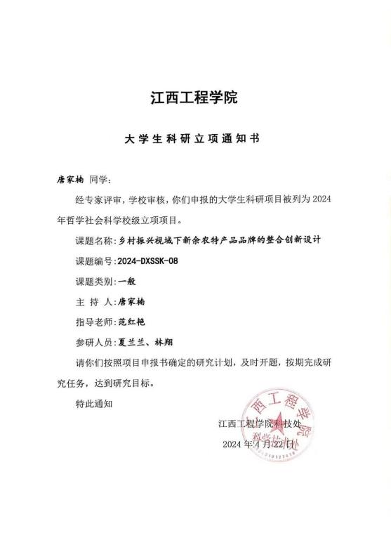 16.参与校级大学生科研项目《乡村振兴视域下新余农特产品牌的整合创新设计》立项