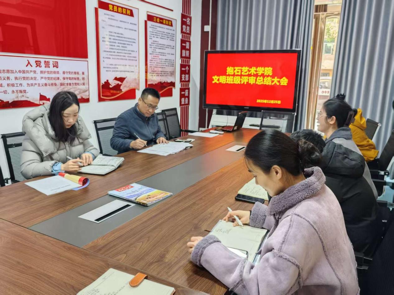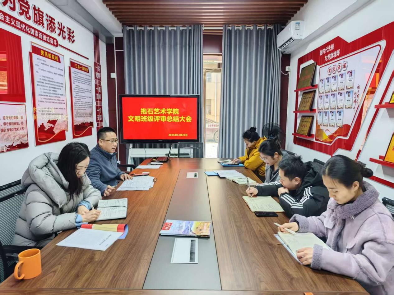 为全面落实立德树人根本任务,进一步强化学风、班风建设,树立先进典型,凝聚集体力量,2025年12月25日上午9时,抱石艺术学院在9栋一站式党员活动室隆重召开2025年度文明班级评审大会。学院党总支书记刘永东、党总支副书记姬赛赛及全体辅导员出席大会。