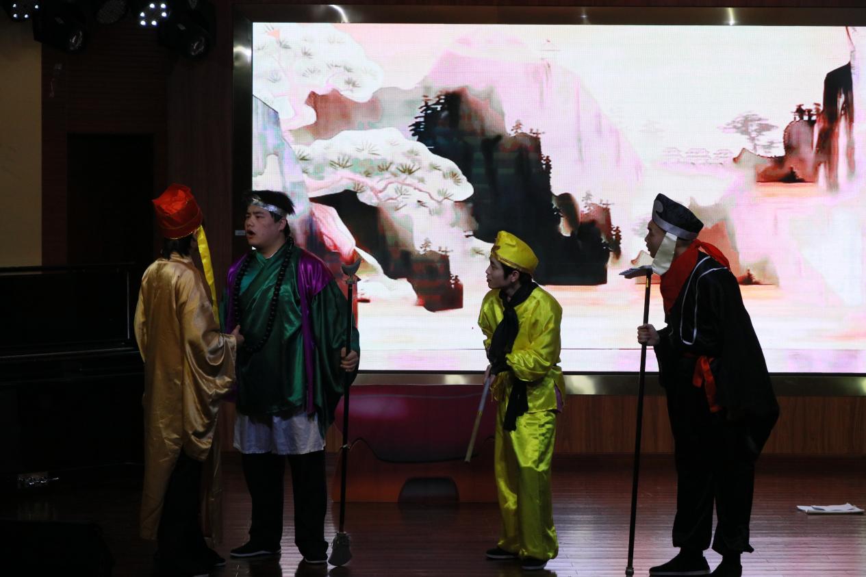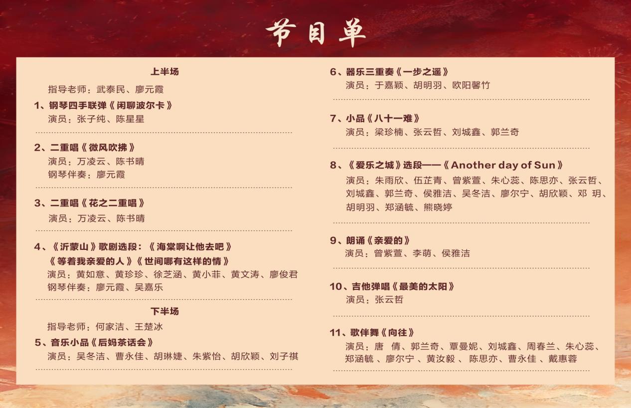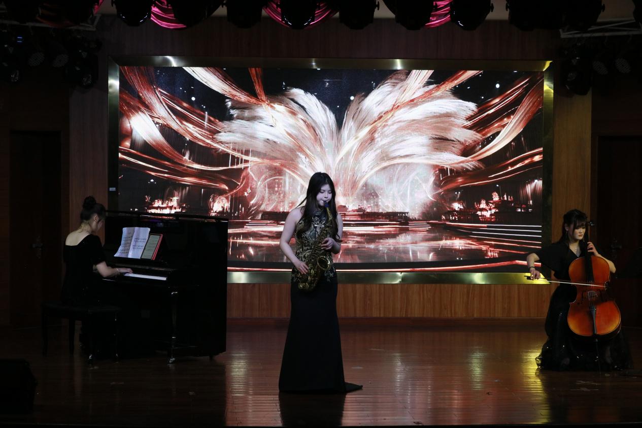 下半场演出由何家洁、王楚冰老师指导,节目形式更为丰富多元。音乐小品《后妈茶话会》中,吴冬洁、曹永佳等演员凭借生动的表演与默契的配合,展现出极强的舞台表现力;于嘉颖、胡明羽、欧阳馨竹带来的器乐三重奏《一步之遥》旋律优美,韵味悠长;小品《八十一难》以幽默诙谐的方式传递正能量,引发观众阵阵欢笑。