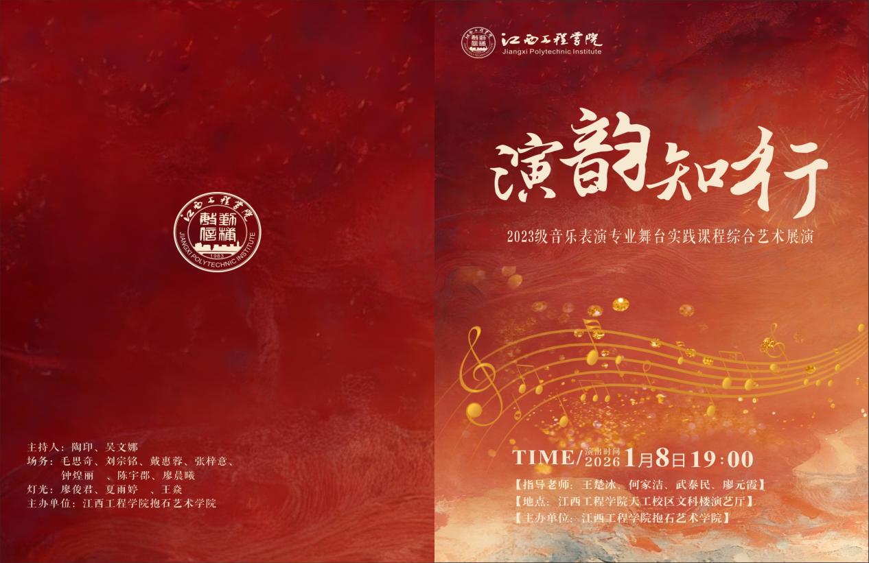 2026年1月8日晚7时,江西工程学院花艺艺术学院在天工校区文科楼演艺厅成功举办了2023级音乐表演专业舞台实践课程综合艺术展演。本次展演以“读韵知行”为主题,集中展示了学生在声乐、器乐、戏剧、舞蹈等多方面的艺术素养与实践能力。学院党政领导班子全体成员,各班级代表观看了演出。