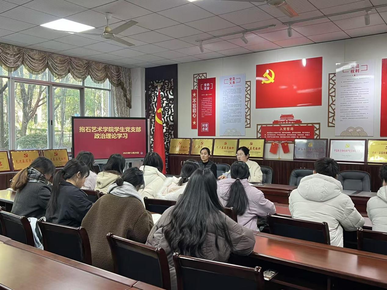 2025年12月26日,抱石艺术学院在艺术楼202党员活动室开展12月政治理论专题学习会。本次会议由学生党支部书记叶丽主持,学生党支部全体党员积极参与,共同深入学习最新的政治理论和政策精神。