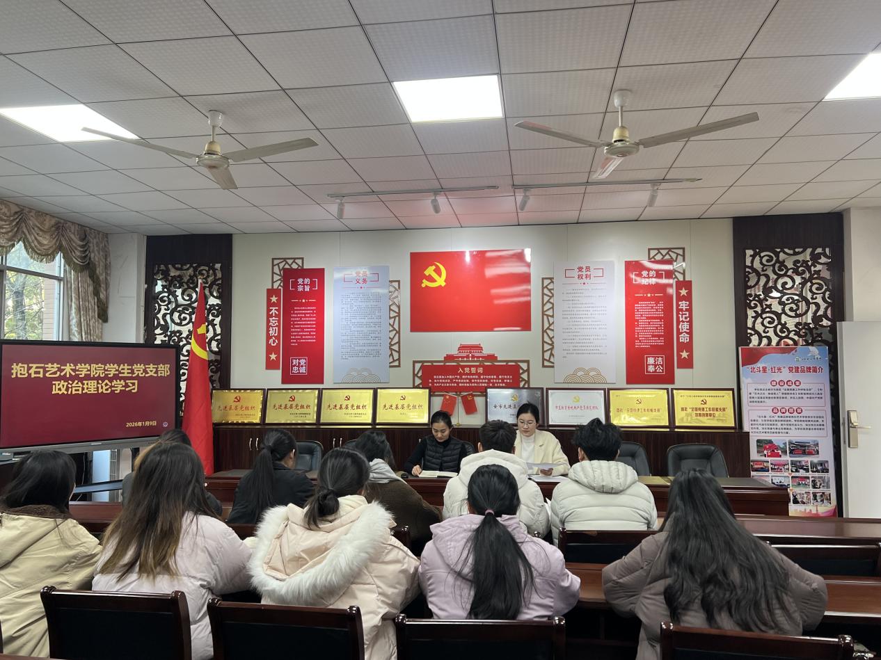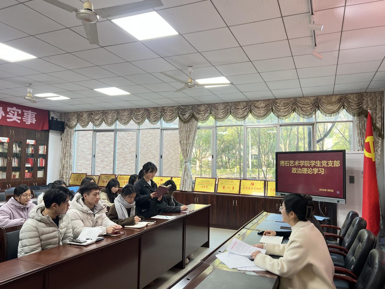 2026年1月9日,抱石艺术学院在艺术楼202教室成功举办了1月政治理论专题学习会。本次会议由学生党支部书记叶丽主持,学生党支部全体党员参与,共同学习了最新的政治理论。