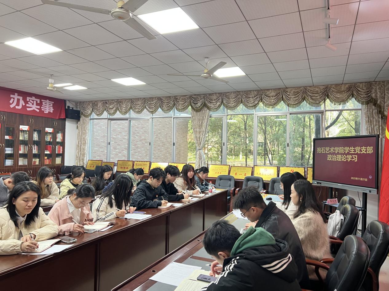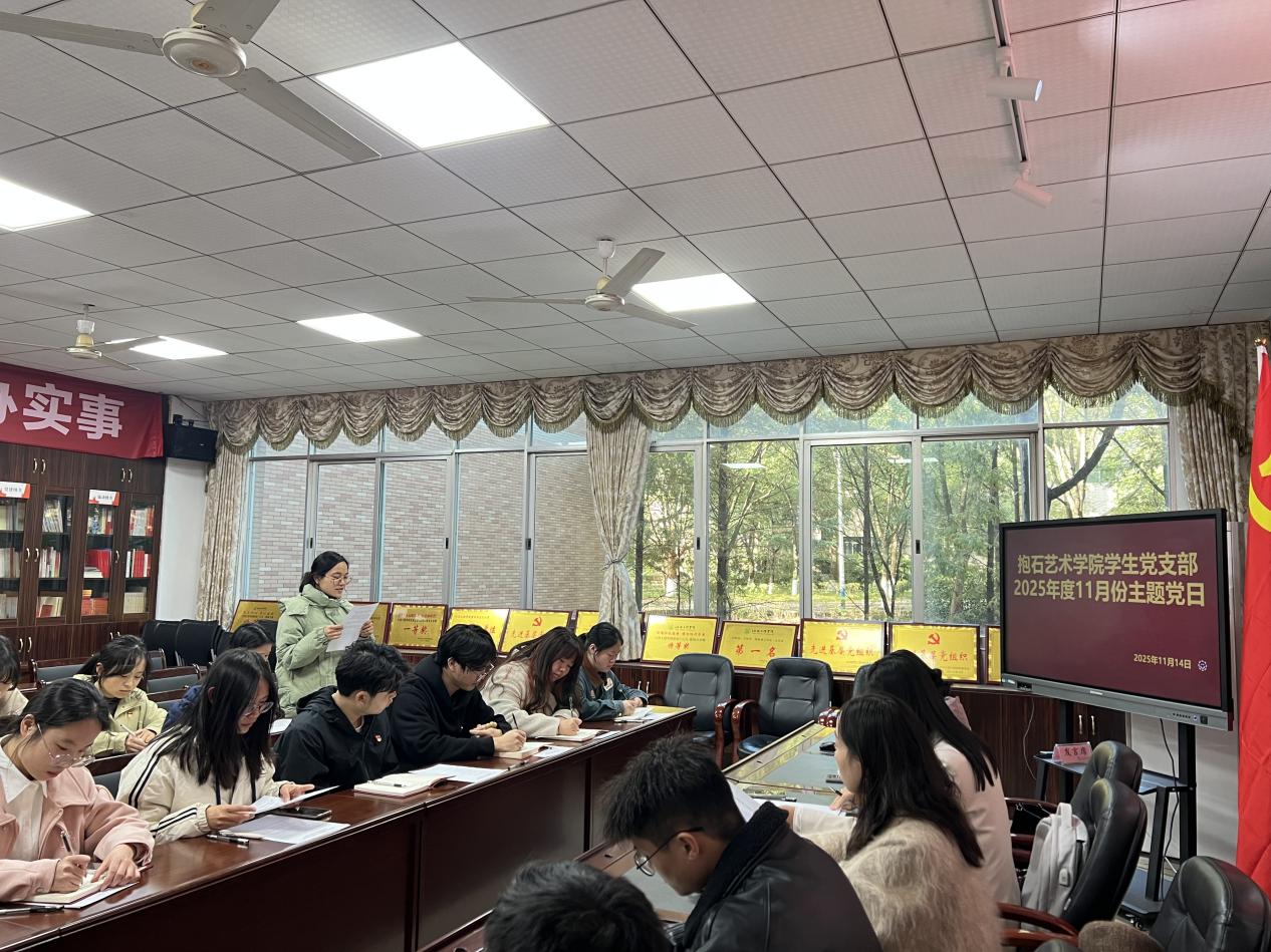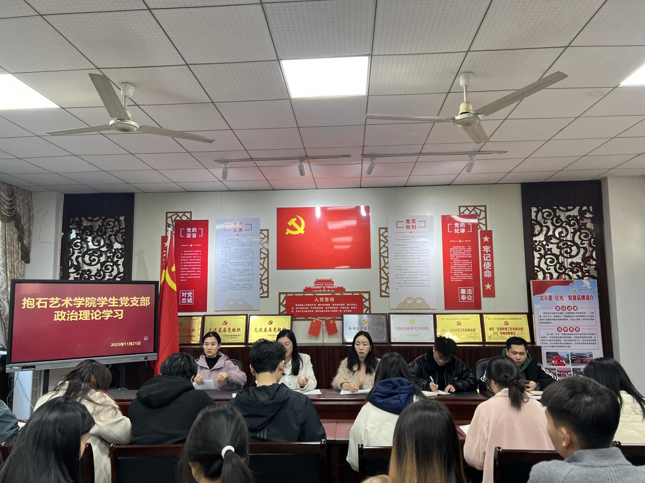 2025年11月21日下午4:00,抱石艺术学院在艺术楼202会议室召开11月政治理论专题学习会。党总支副书记姬赛赛、学生党支部书记叶丽以及全体党员学生参加会议,会议由学生党支部书记叶丽同志主持。