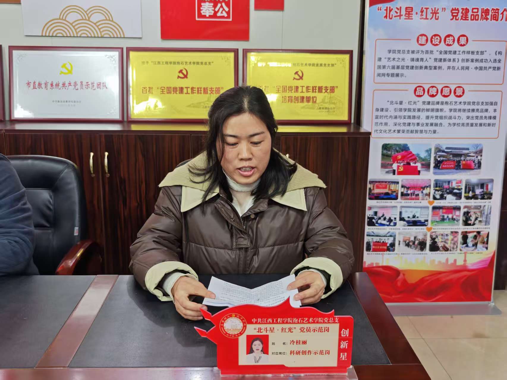 在示范岗党员代表发言环节,教学先锋示范岗“耘星”代表熊秀、科研创作示范岗“创新星”代表冷桂丽、服务保障示范岗“护航星”代表王康依次上台。他们结合自身岗位实际,分享了对于党员示范岗的认识、体会,表达了珍惜荣誉、履职尽责、争当表率的坚定决心,并围绕未来如何在教育教学、科研创新、管理服务中更好发挥先锋模范作用阐述了具体计划,发言情真意切,承诺铿锵有力,展现了新时代党员教师的风采与担当。
