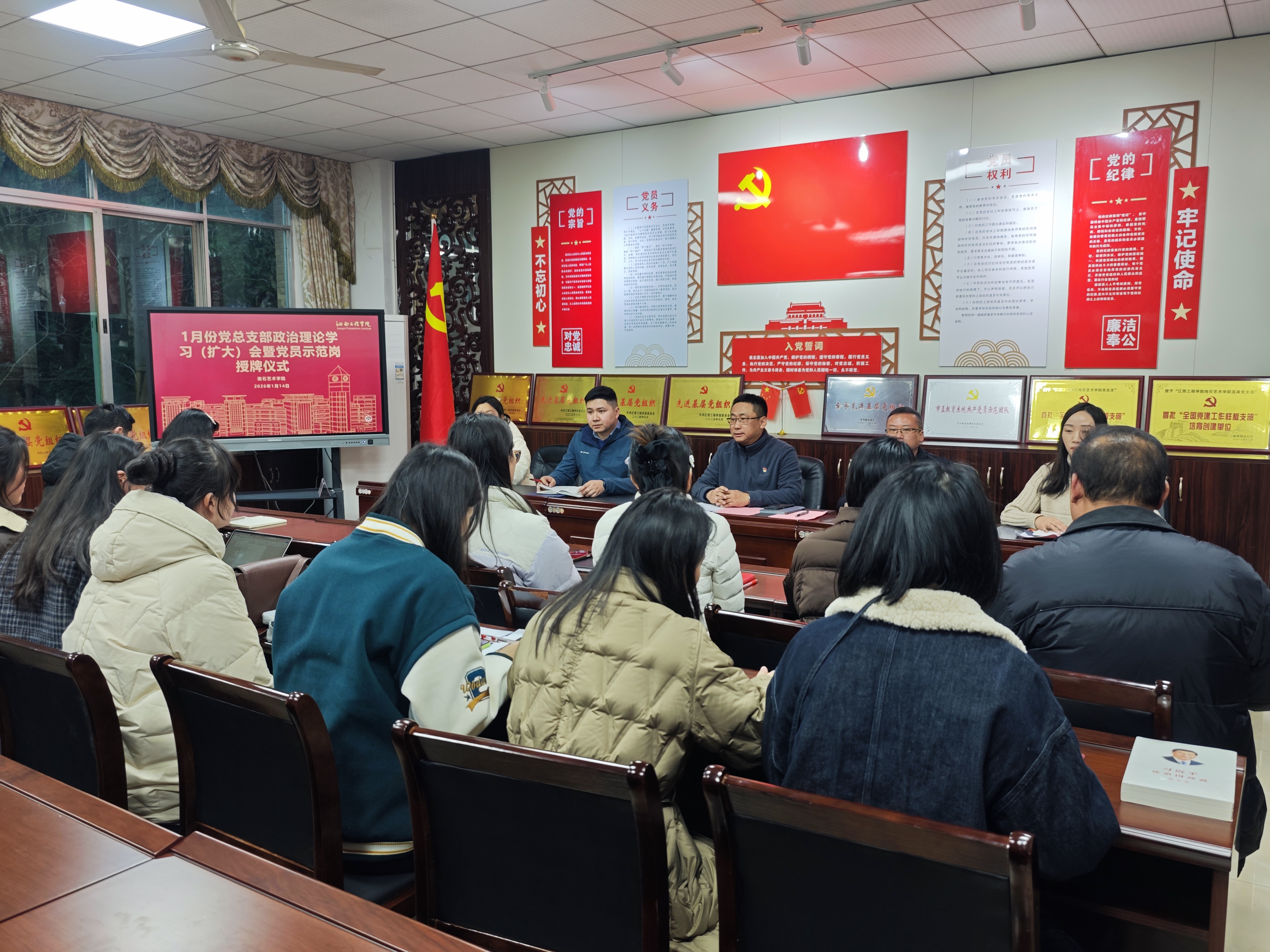 为持续深化作风建设,凝聚发展合力,2026年1月14日下午,抱石艺术学院在艺术楼202党员活动室召开党总支政治理论学习(扩大)会。会议聚焦“锲而不舍落实中央八项规定精神,以优良作风凝心聚力真抓实干”主题,开展集中学习研讨,并就全力迎接本科教学工作合格评估进行再动员、再部署。学院党总支副书记姬赛赛主持会议,院长张志胜、党总支书记刘永东、副院长王冬冬、罗文艳,各教研室主任及全体教师党员参加会议。
