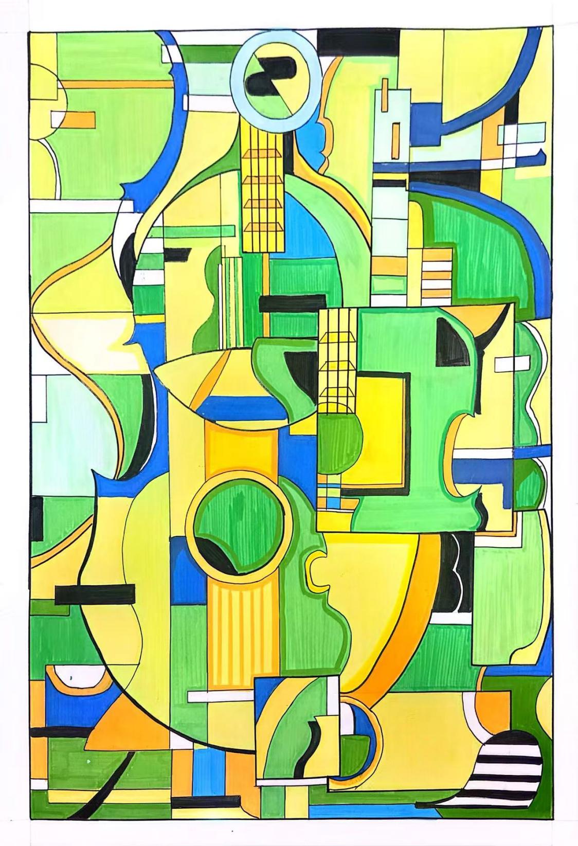 设计说明:这幅作品以黄绿为主色调,结合几何与有机形态的抽象拼贴,通过块面分割与线条穿插营造富有韵律的视觉节奏。明快的色彩传递出盎然生机与活力,试图在解构与重组的视觉游戏中,探索自然秩序与现代美学的融合,让观者在流动的色块与线条间感知平衡与张力的微妙关系。