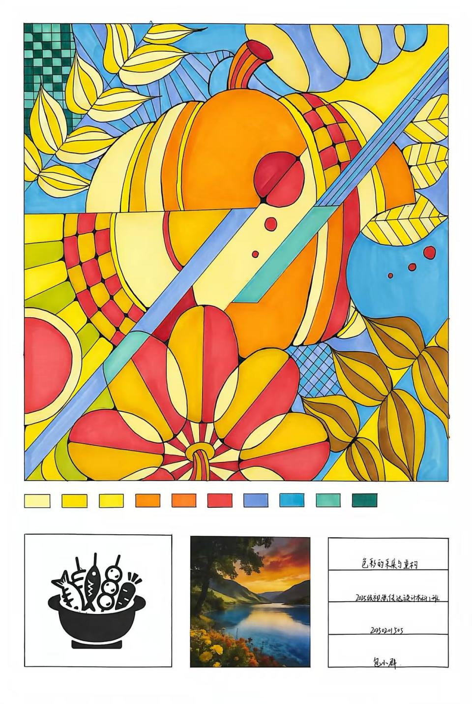 设计说明:作品提取了自然风景中暖橙、明黄与湖蓝的色彩关系。将南瓜、花叶等自然元素进行几何化拆解,以马赛克式的块面与线条重新组合。高饱和度色彩形成强烈视觉张力,蓝绿冷色线条穿插其中,既丰富了层次,又平衡了暖色调的热烈感。