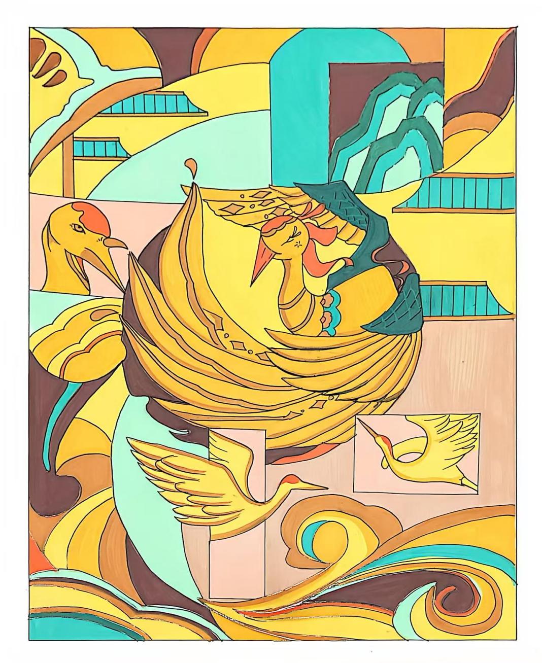 设计说明:作品采用“解构-重组”的构成方式,以黑色线条切割出不规则的有机块面,既保留了鹤形的辨识度,在统一的视觉框架下展现不同色调的表现力,完成从具象到抽象、从单一到丰富的视觉转化,让鹤的灵动姿态在色彩的碰撞与融合中焕发出多元的视觉魅力。