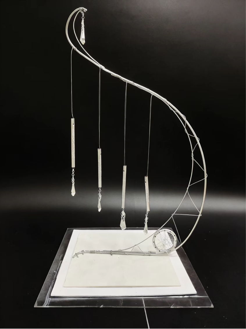 设计说明:本作品以流动的韵律为核心创作主题,灵感源于音乐旋律的曲线形态与自然中的动态弧线。采用金属线材弯折出流畅的S形主结构,模拟旋律的起伏轨迹,金属的冷硬质感与曲线的柔婉形态形成视觉反差。悬挂的金属长条形构件与水晶坠饰,以错落的间距营造出节奏性的视觉层次,呼应音符的排列;水晶的通透质感与金属的光泽交织,在光影下产生灵动的反光效果。作品意在将抽象的听觉韵律转化为视觉实体,通过材质、形态与光影的结合,探索动态美学与空间韵律的表达。