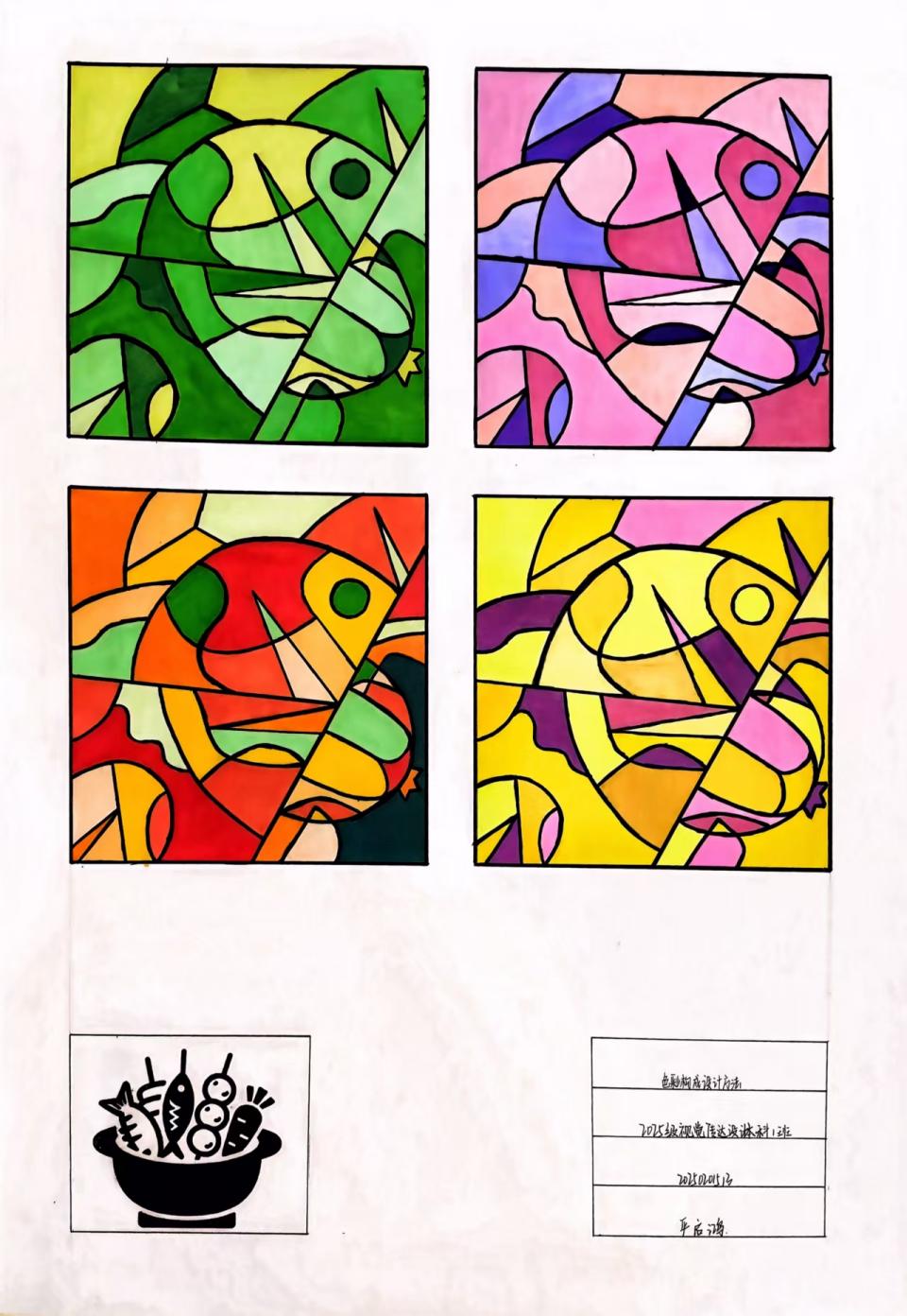 设计说明:作品采用“解构-重组”的构成方式,用黑色线条切割出不规则的有机块面,既保留了鱼形的辨识度,又通过抽象化处理增强画面的现代感。每幅作品均遵循色彩构成的核心原理,通过同类色渐变、邻近色搭配与互补色对比等手法,在统一的视觉框架下展现不同色调的表现力,从而完成从具象到抽象、从单一到丰富的视觉转化。