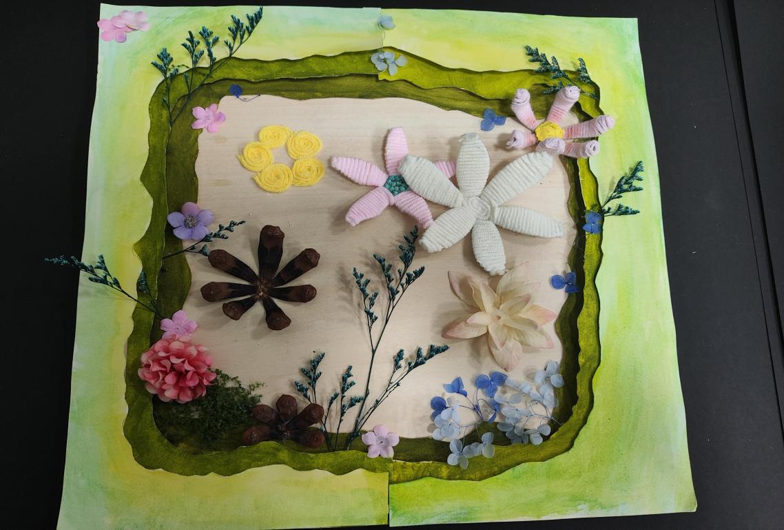 设计说明:本作品以春日花园为灵感,采用复合材料创作。以渐变黄绿卡纸做基底,用扭扭棒、干花、松果等材料制作立体花卉,通过高低错落的排布营造层次。自然材料与手工织物结合,在平面空间中构建出富有生机的立体花艺场景,展现自然肌理与手工创意的融合之美。
