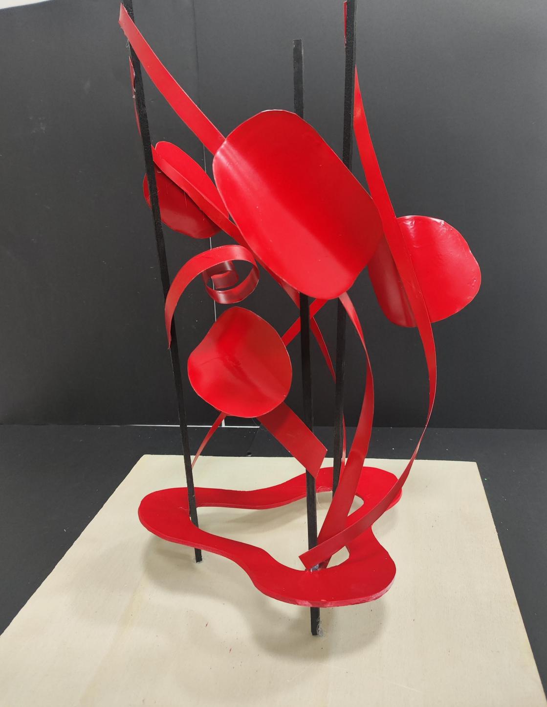 设计说明:本作品为立体构成装置,以红色曲面造型与黑色支撑结构构建视觉张力。红色块面与线条通过错落排布形成流动的韵律感,黑红配色强化视觉冲击。作品打破平面局限,在三维空间中探索形态的动态平衡,展现现代抽象雕塑的视觉表现力与空间张力。