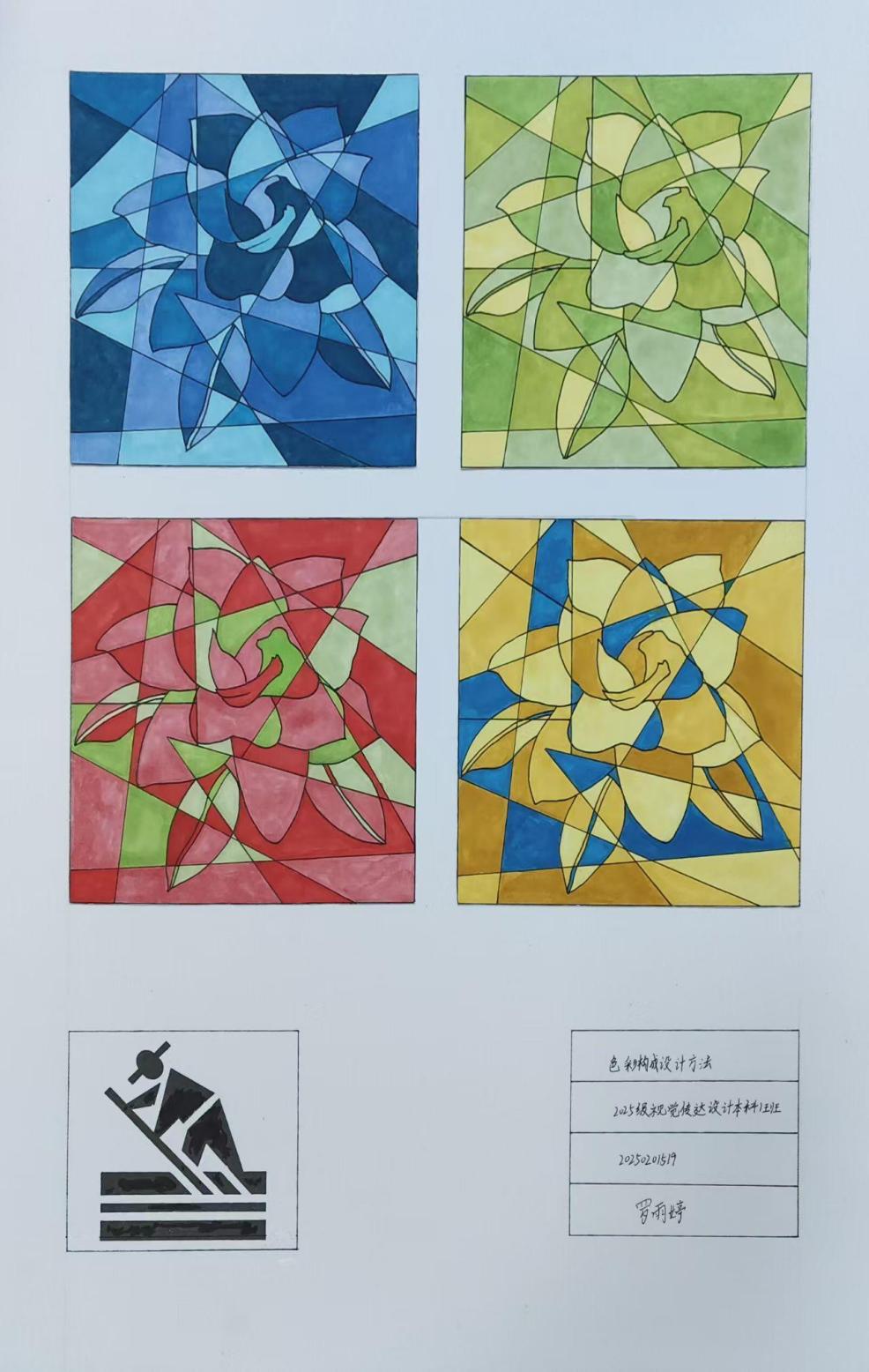 设计说明:这组作品以花卉为原型,通过几何切割重构形态,分别运用蓝色调、绿色调、红绿对比调与黄蓝点缀调,探索色彩的明度层次与情感表达。冷色调营造静谧,暖色调传递活力,对比色强化视觉张力,展现色彩构成在形态解构与重组中的韵律美感。