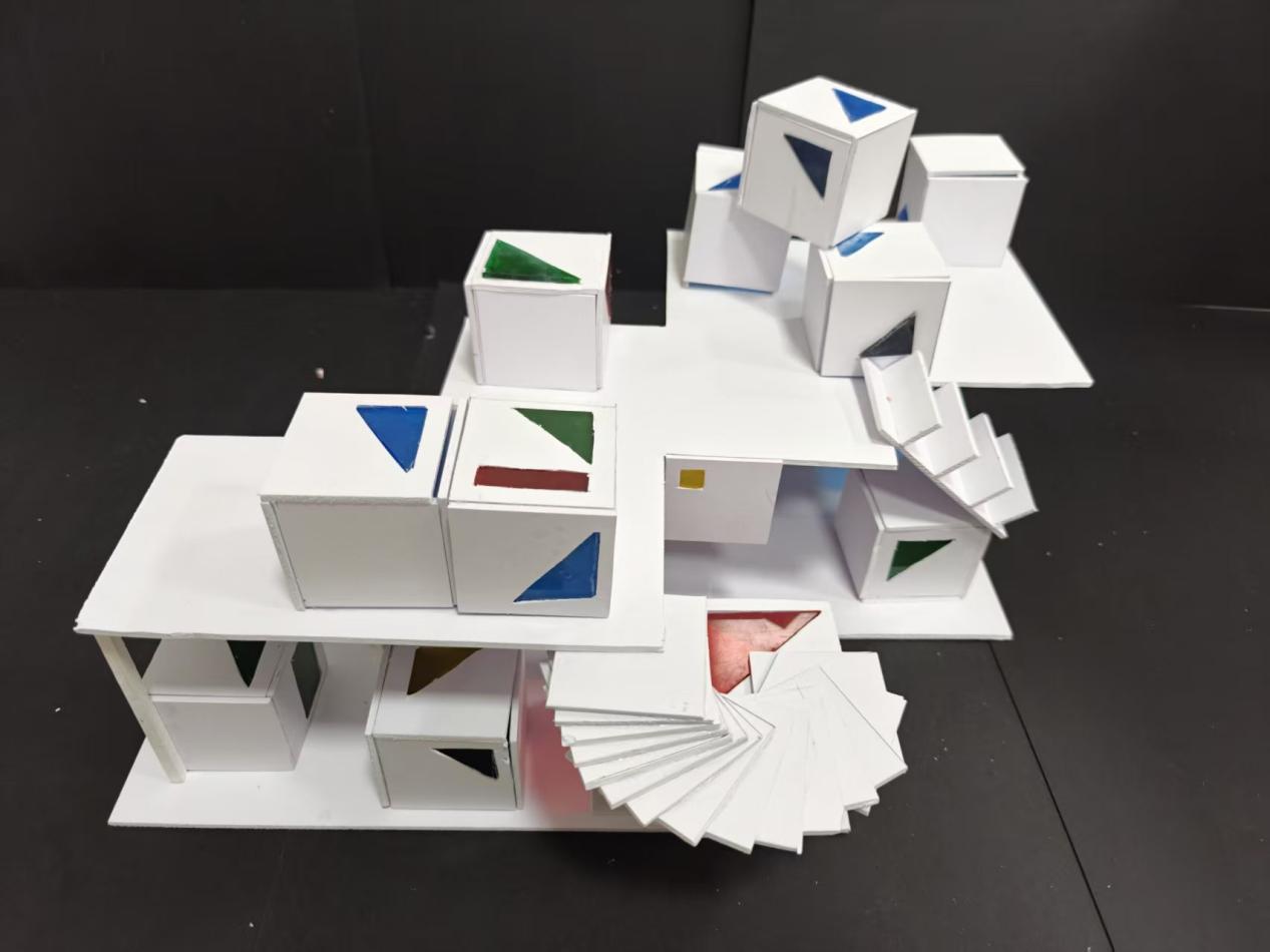设计说明:蒙德里安风格的建筑空间装置,设计核心是将荷兰画家皮特。蒙德里安的几何抽象美学转化为三维建筑空间,以蒙德里安标志性的几何抽象+三原色+非彩色为视觉语言,把平面画作里的色块、折线转化为建筑的体块、开窗与空间层次用白色立方体、错落的平台构成“碎片化”的建筑体,模拟现代建筑的“非对称、多维度”布局在白色体块上嵌入彩色几何形窗洞,既是蒙德里安色块的呼应,也让空间有了虚实对比加入螺旋楼梯、错层平台,强化空间的“流动性,让静态的几何体块产生动态的行走体验通过”平面抽象一三维建筑”的转译,既还原了蒙德里安的理性秩序感,又用错层、体块穿插体现了现代建筑的空间开放性,是艺术风格与建筑功能的结合实验。