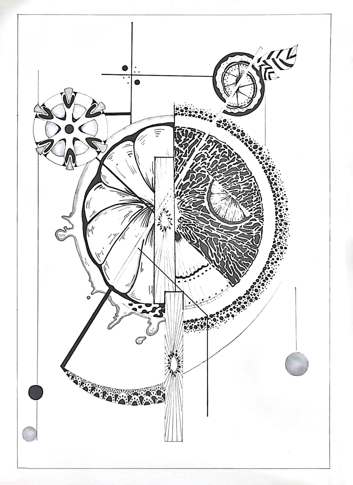 设计说明:将柑橘类水果做半剖处理,一侧是细腻的写实排线,呈现果肉的柔软肌理;另一侧则以黑底白纹构成抽象化的细胞纹理,形成生物形态与几何秩序的视觉张力,也进行了疏密的对比。画面中穿插的直线、墨点与泼墨痕迹,打破了圆形主体的封闭感,让有机形态与理性线条相互碰撞。