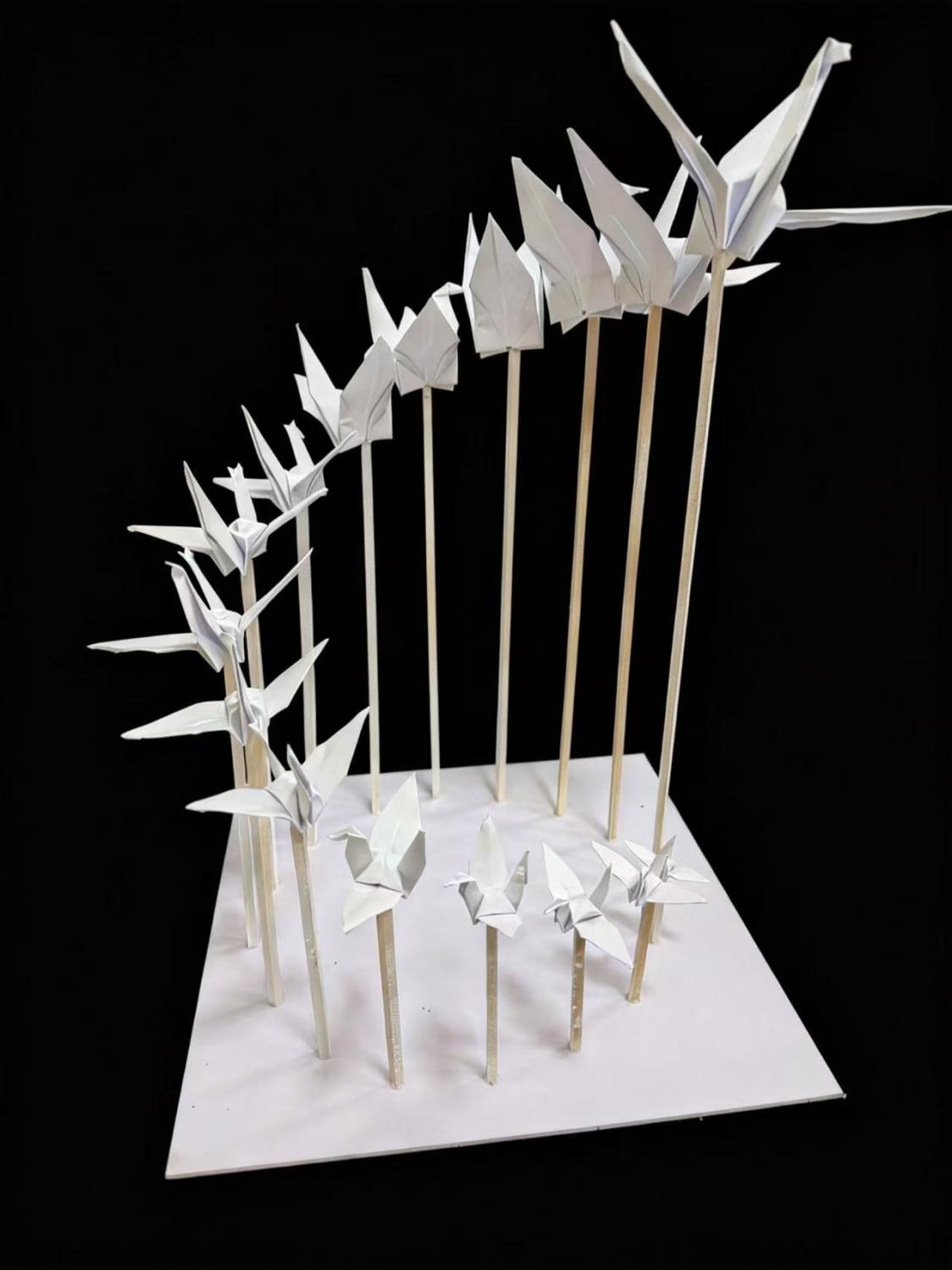 设计说明:作品采用“解构-重组”的构成方式,以折纸工艺解构鹤的形态并重组为序列化的立体单元。通过不同高度的支撑结构,将纸鹤排布成富有韵律的上升曲线,既保留了鹤的形态辨识度,又通过半立体的空间处理增强了画面的现代感与层次感。作品遵循立体构成的核心原理,运用重复、渐变与疏密对比等手法,在统一的视觉框架下展现空间与形态的表现力,从而完成从平面到立体、从单一到序列的视觉转化。