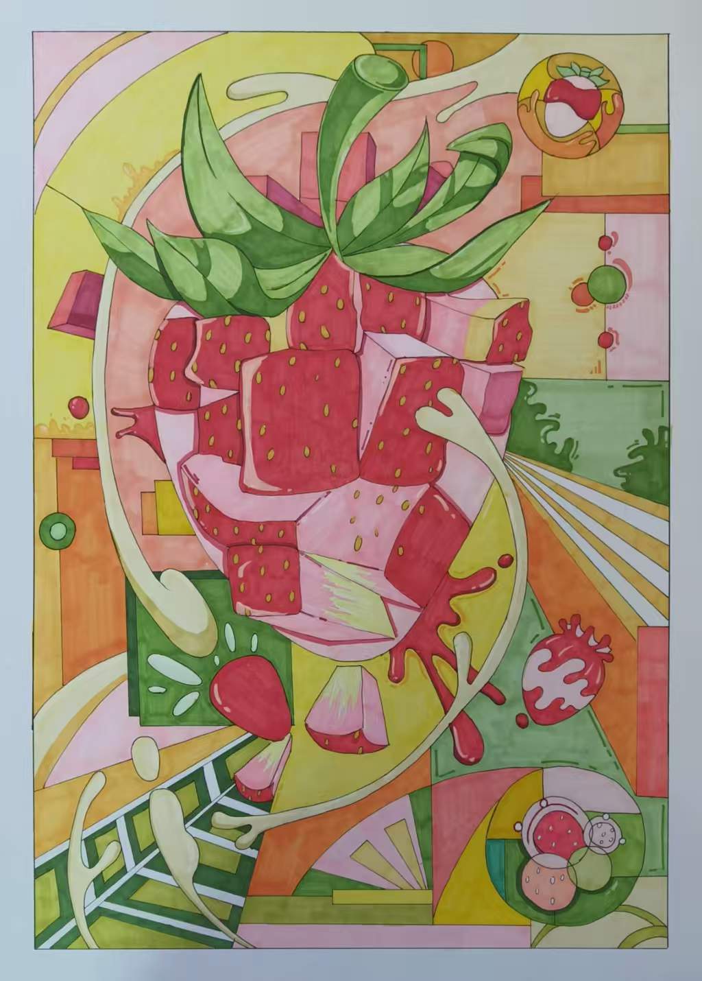 设计说明:作品以“解构重组”为创作手法,将巨型草莓作为核心视觉符号,通过块面切割、色彩渐变与形态错位,草莓的果肉被拆解为大小不一的几何块,红粉渐变的色彩模拟果肉的通透质感,表面的黄色籽点则强化了物象的识别性。背景流动的曲线与放射状线条,与主体的硬朗块面形成对比,营造出动态的视觉张力,探索水果形态的多元表达可能。