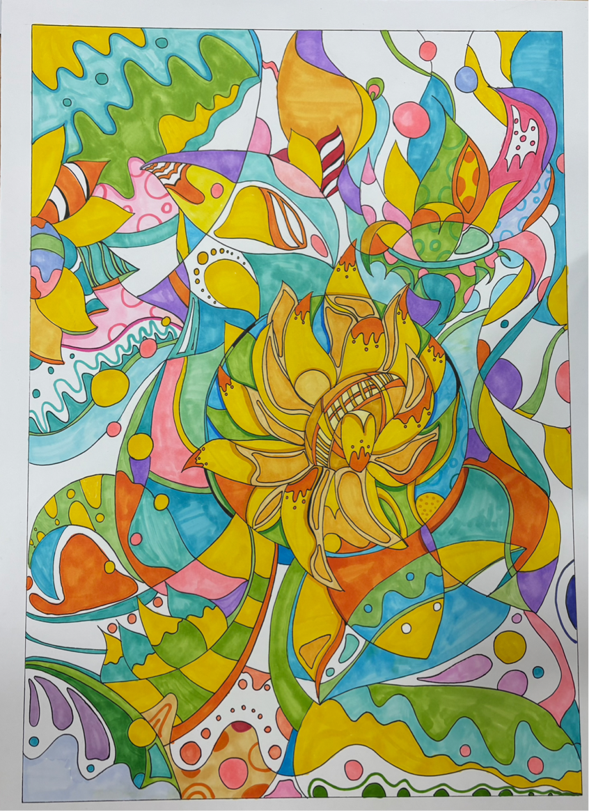 设计说明:作品以中心式的金黄色的向日葵抽象花朵为视觉核心,周围环绕着流动的有机形态与明快的色彩块面。画面融合了曲线、圆点与不规则形,呈现出丰富的色彩层次与动感,传递蓬勃的生命力与愉悦的视觉体验,表达对自然生长与生命活力的赞美。