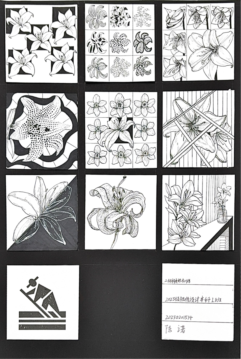 设计说明:元素与形式:从写实的百合花朵写生出发,逐步过渡到形态解构、重复排列、正负形转换与肌理填充。作品包含写实描绘、网格重复、抽象变形等多种表现方式,通过单元素的多形式演绎,训练形态的观察与重构能力。
