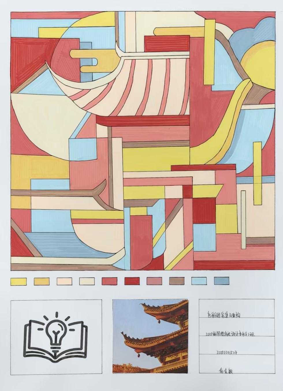 设计说明:作品以中式古建筑为灵感,提取飞檐、斗拱等经典元素,通过几何分割与色彩重构的方式进行创作。画面保留红、黄、蓝等传统建筑色彩,同时以现代构成手法将元素抽象化,用直线、块面分割重组,打破传统建筑的具象形态,展现传统元素的创新表达。