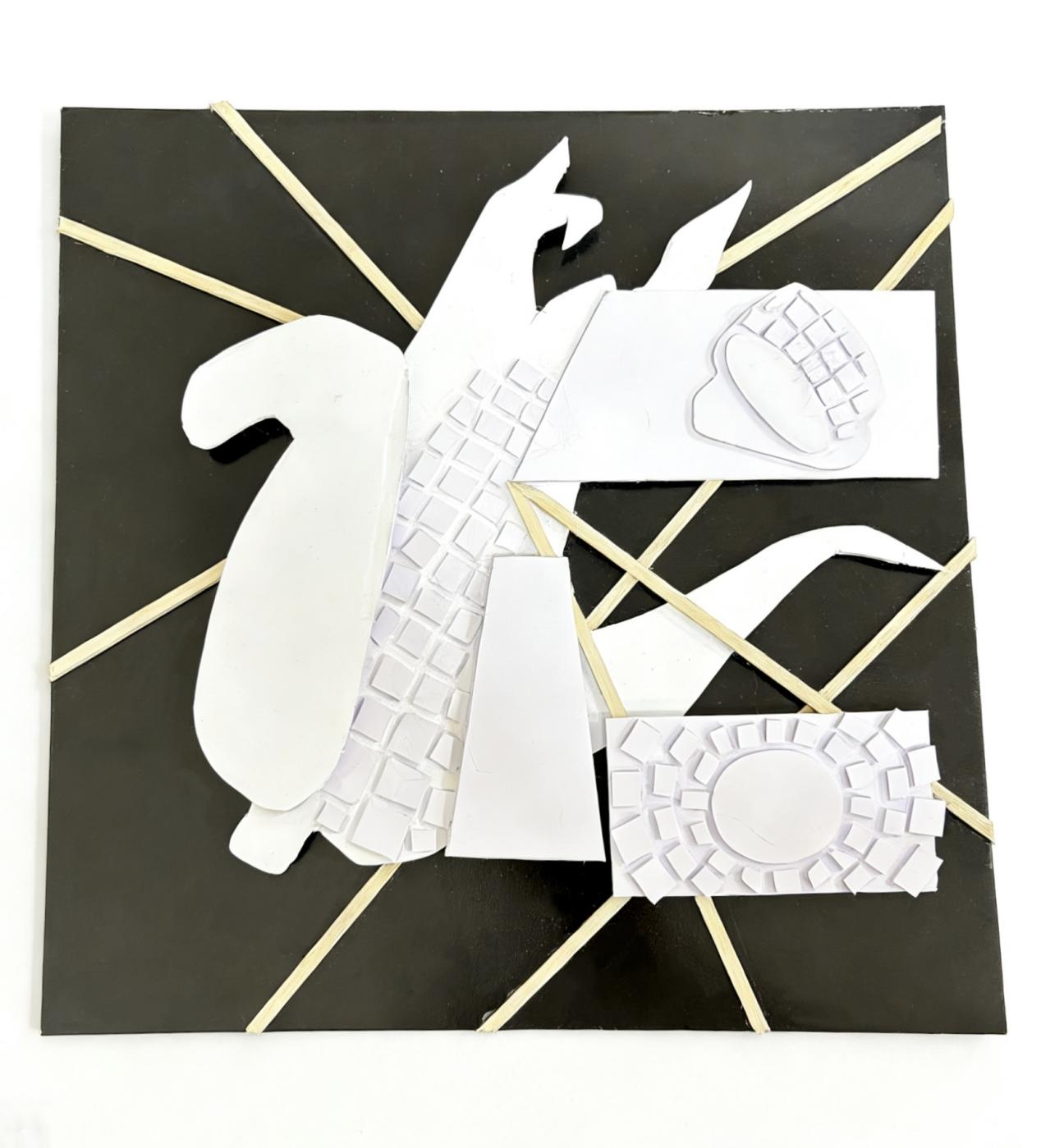 设计说明:分割构成是平面与立体构成的核心技法之一,本作品摒弃传统对称分割的规整感,采用非规则放射式分割与块面分割结合的方式:以木棍的线性元素构建放射状的分割框架,模拟光线穿透黑暗的视觉效果;再以雪弗板的块面元素在分割框架中进行不规则填充,通过形态的大小、肌理、虚实对比,打破线性分割的单一性,形成“线定框架,面塑层次”的视觉逻辑。作品中抽象的几何块面组合,也隐喻着碎片化的元素经分割重构后,能形成全新的视觉整体,体现构成设计中“整体与局部”的辩证关系。