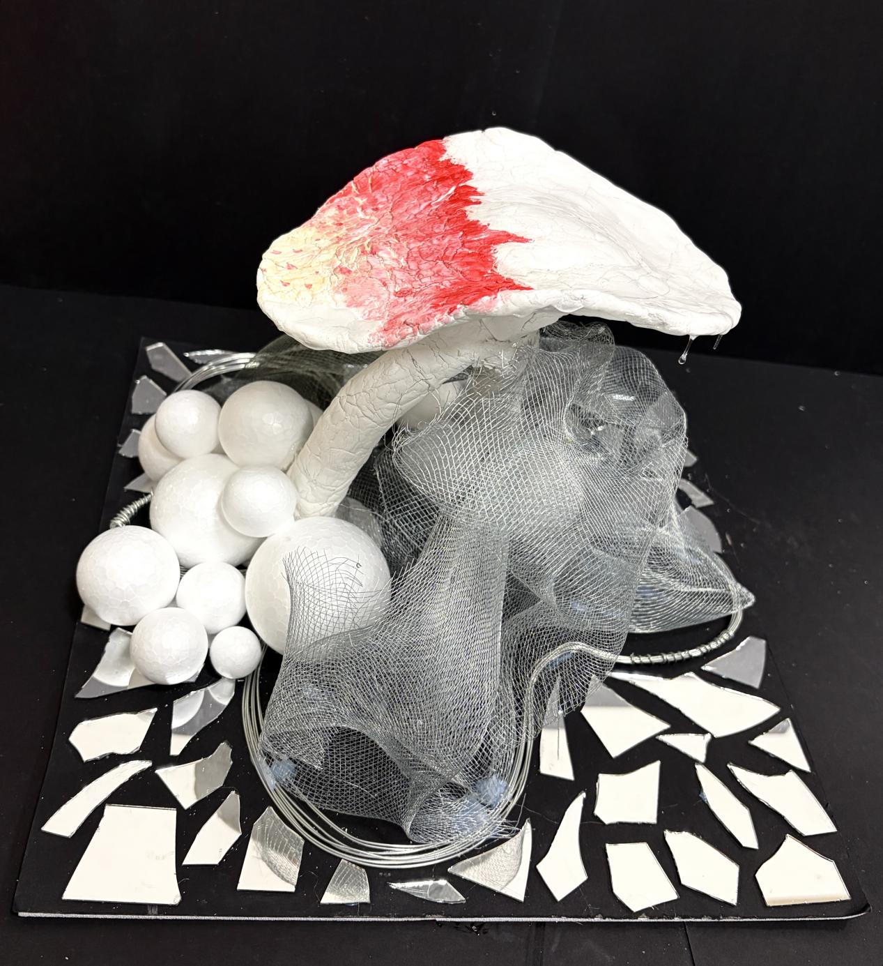 设计说明:蘑菇作为自然中极具生命力的象征,即便在阴暗、破碎的环境中也能蓬勃生长,与“破镜重生”的主题形成强关联。作品中,破碎的镜面代表生命遭遇的困境与残缺,而从镜面碎片中破土而出的蘑菇,则象征着在逆境中迸发的生长力量;蘑菇菌盖的红白色渐变,既还原了自然中蘑菇的视觉特征,又以红色的热烈凸显生命的鲜活,白色的纯净象征新生的希望,整体造型向上舒展,强化了“顽强生长”的动态。