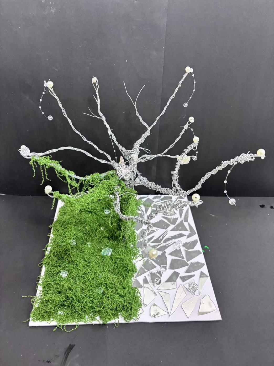 设计说明:这件三维构成作品以 “共生” 为主题,通过左右分区的形式,将永生苔藓的自然肌理与镜面碎片的人工反光并置,营造出自然与虚幻的强烈对比。金属铁丝扭结成的枝蔓连接起两侧区域,枝上点缀的珠饰如同凝结的露珠,在镜面折射下形成错落的光影层次。作品以极简的材料组合,探讨自然生长与人工构建的对话关系,在虚实交织的视觉体验中,传递出生命在多元场域中延伸的意象。