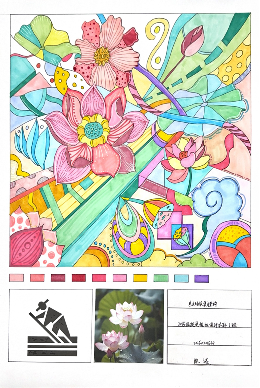 在这里,学习不再是对形式法则的被动记忆,而是主动地探索与建构。学生从生活与经典中观察,汲取视觉养分;以理性眼光解构,提炼形式语言;最终在具体命题中应用,完成从元素到作品、从认知到创造的跨越。课程聚焦培养未来设计师必备的三大核心素养:系统性造型组织能力、策略性色彩配置能力,以及多维空间建构能力。